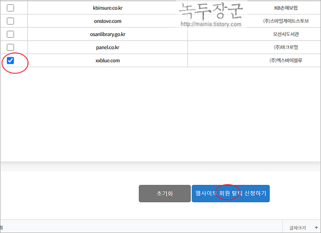 ▼ 해당 사이트를 찾았다면 체크하고 아래로 내려가서 웹사이트 회원 탈퇴 신청하기 버튼을 클릭합니다.