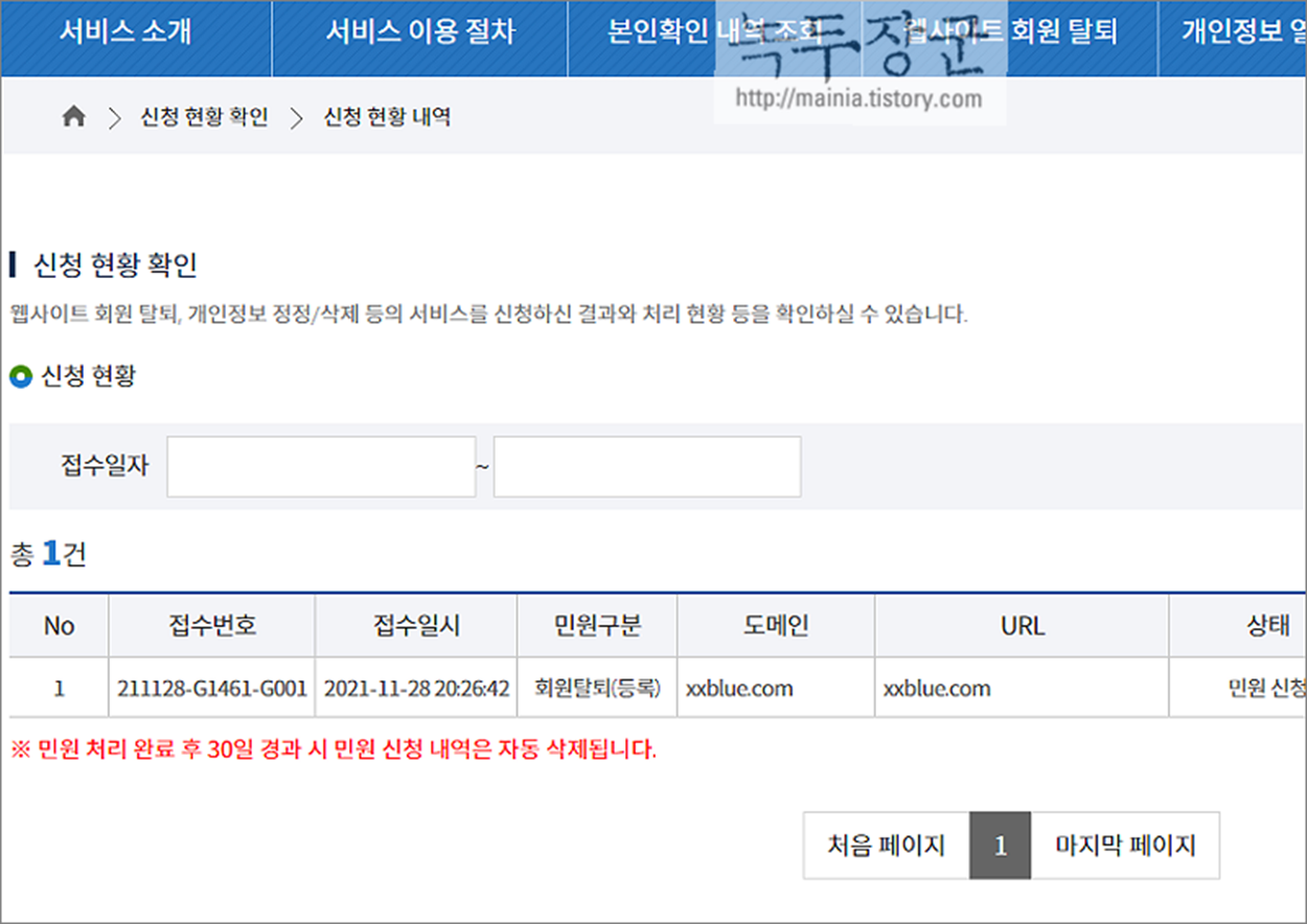 ▼ 신청 결과 페이지에서 접수를 확인할 수 있습니다. 이제 몇일만 지나면 탈퇴 결과를 메일로 알려줍니다.