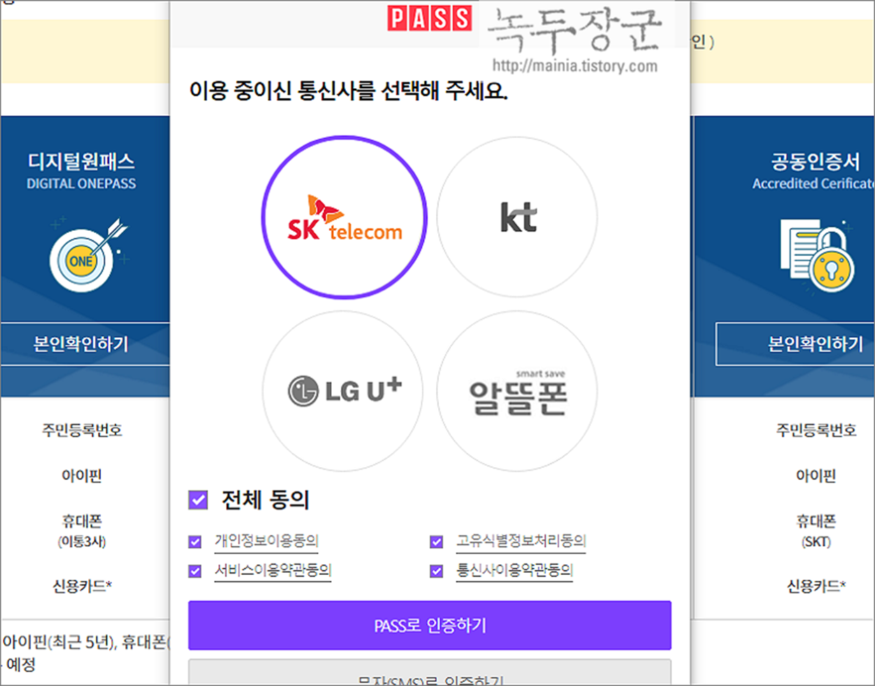 ▼ 자신이 가입한 통신사 선택 후 전체 동의하고 문자 혹은 PASS 앱으로 인정할 것인지 정합니다.