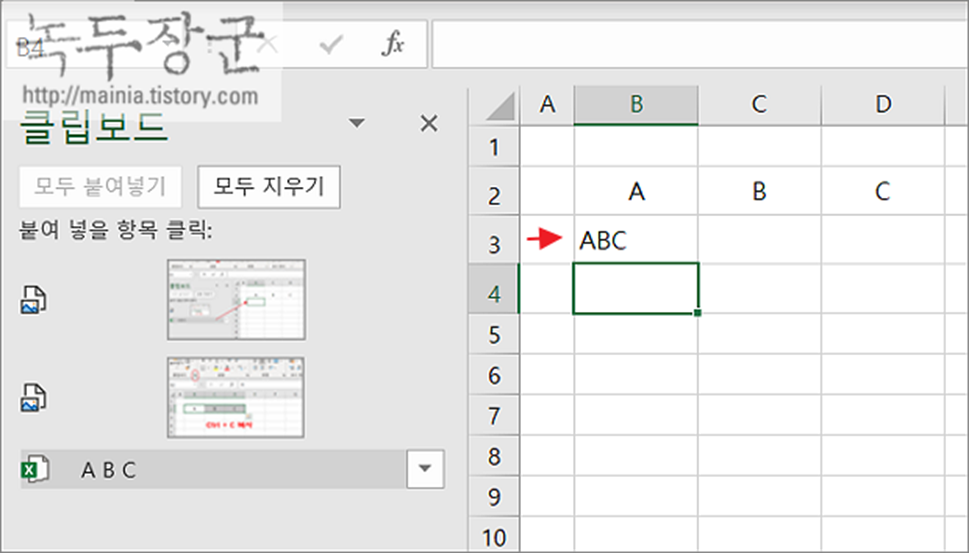 ▼ 셀에 커서를 위치시키고 왼쪽 클립보드 값을 클릭합니다.