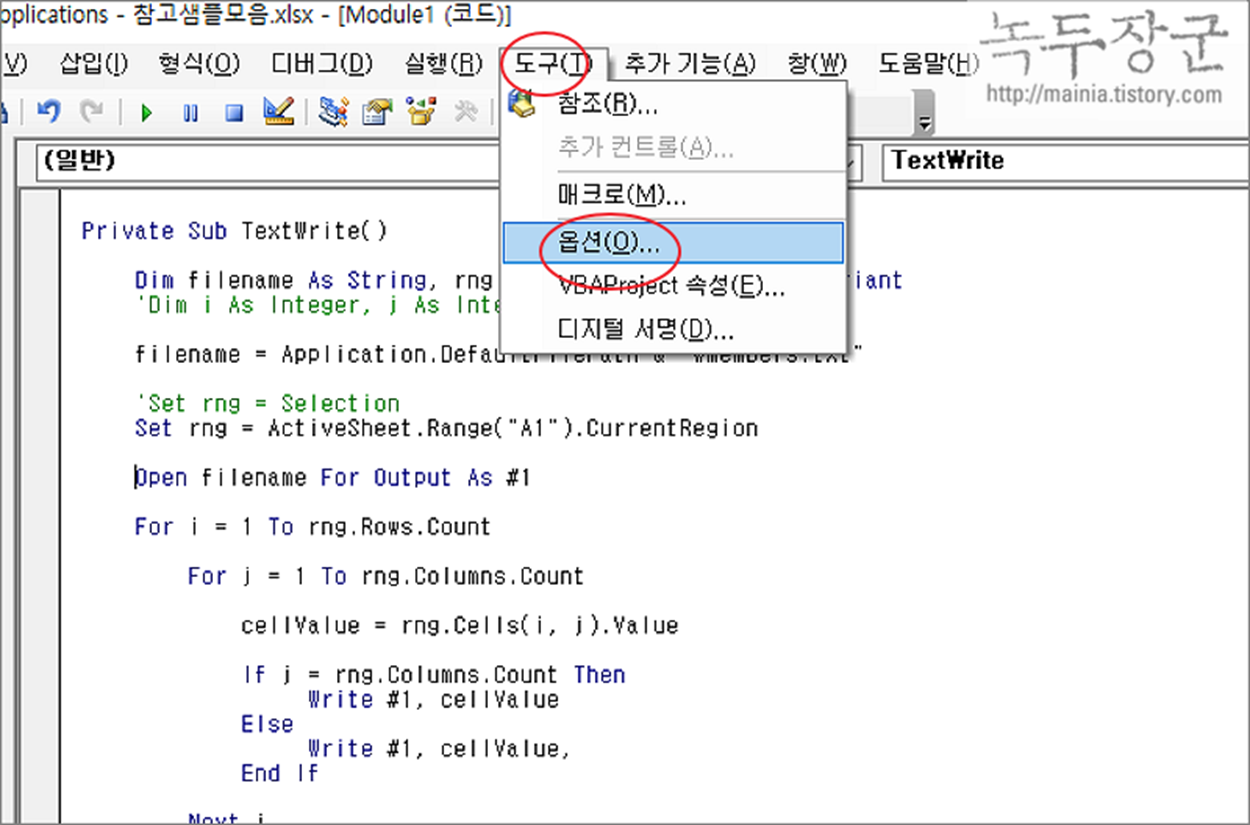 ▼ 매번 Option Explicit 문구를 입력하기 귀찮으시다면 자동 입력되도록 설정을 변경해 보세요. 상단 도구 > 옵션 메뉴를 클릭합니다.