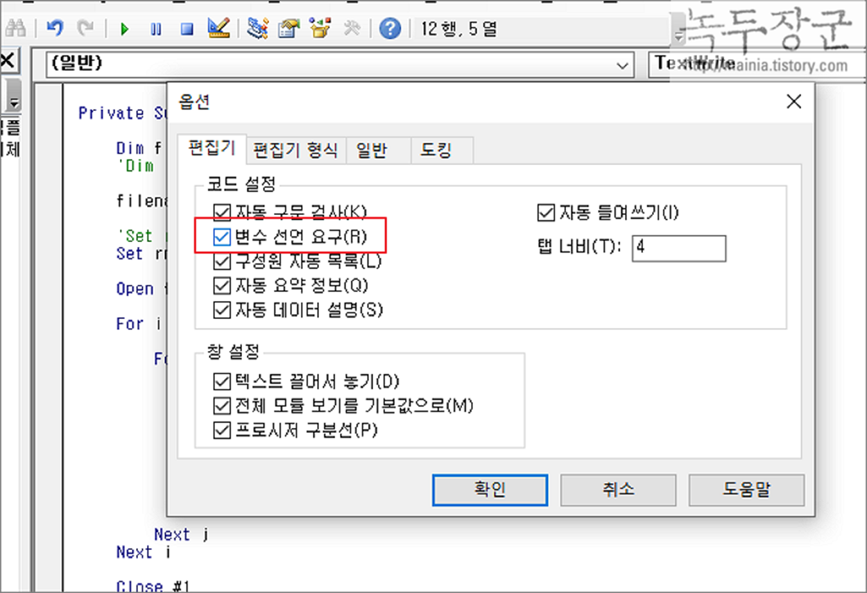 ▼ 옵션 대화상자에서 편집기 탭으로 이동합니다. 편집기 탭 화면에서 "변수선언 요구" 옵션을 체크합니다. 해당 옵션은 모듈을 만들었을 때 일일이 상단에 입력하지 않아도 자동으로 Option Explicit 문구가 들어가게 합니다.