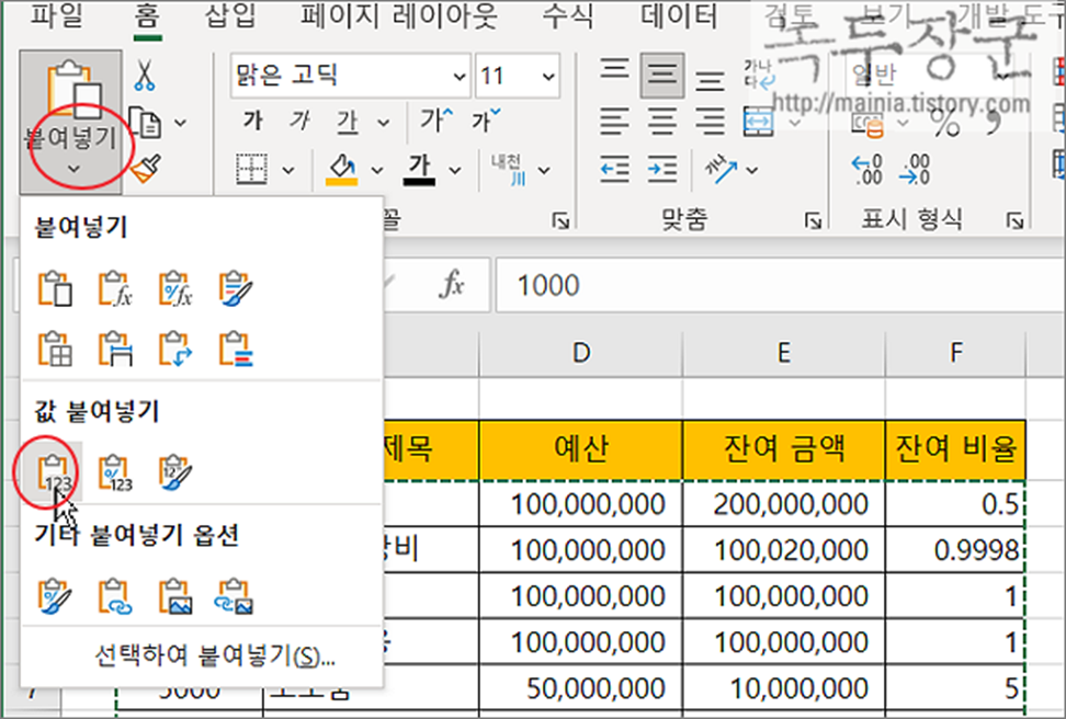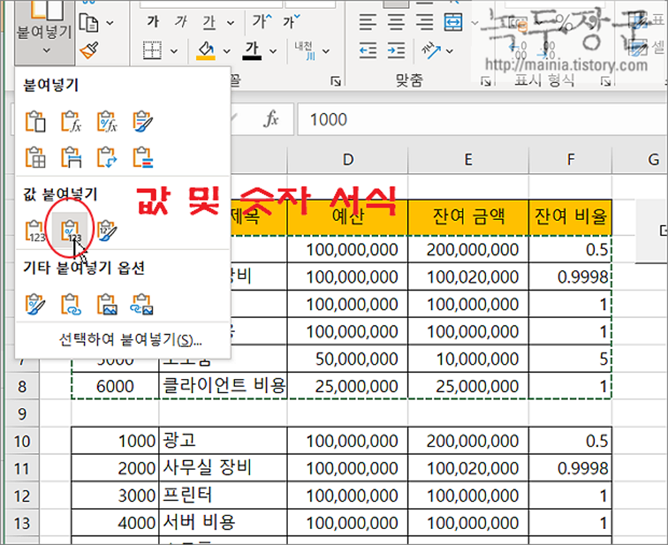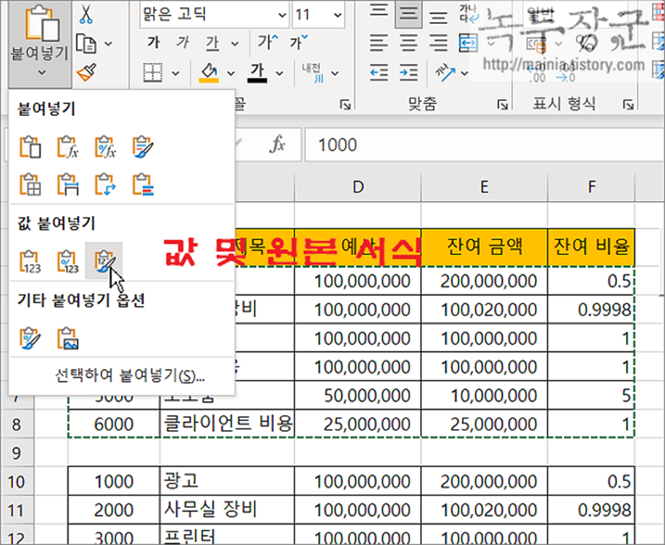 ▼ 또는 값 뿐만 아니라 이전 복사한 영역의 서식을 모두 붙여 넣을 수도 있습니다. 값 붙여넣기 의 제일 오른쪽 아이콘인 "값 및 원본 서식" 아이콘을 클릭합니다.