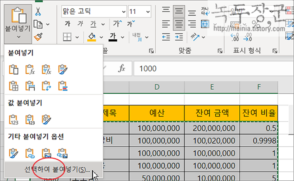 ▼ 아이콘이 익숙하지 않으시면 다른 방법을 사용해 보세요. 메뉴에서 “선택하여 붙여넣기” 를 선택합니다.