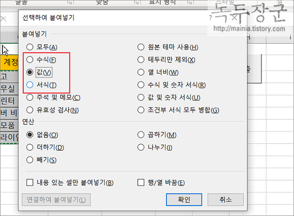 ▼ "선택하여 붙여넣기" 팝업창에는 위에서 보았던 메뉴들이 선택 옵션으로 배치되어 있습니다. 붙여넣기 > 값, 수식, 서식 중 하나를 선택하고 확인 버튼을 눌러서 원하는 데이터만 골라 붙여 넣습니다.