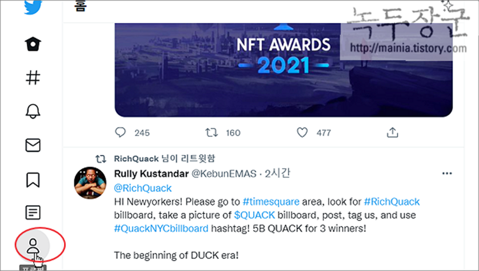 ▼ PC 웹 브라우저 화면에서 트위터에 접속하면 왼쪽 사이드에 메뉴 목록을 볼 수 있습니다. 제일 하단에 사람모양의 프로필 아이콘을 클릭합니다.
