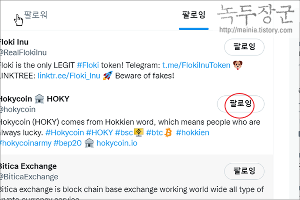 ▼ 팔로우 목록에서 해제하고 싶은 특정 계정을 찾습니다. 오른쪽 끝에 팔로잉 버튼에 마우스를 가져가면 언팔로우 로 바뀝니다. 버튼을 클릭해서 팔로잉을 해제를 위한 팝업창을 띄웁니다.