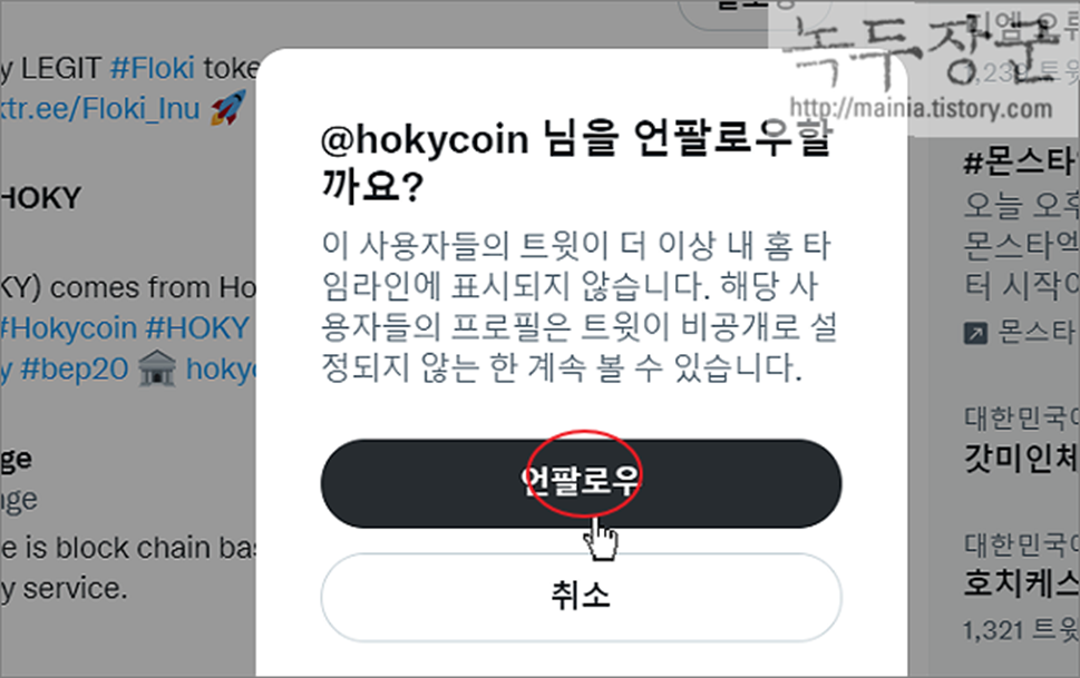 ▼ 팝업창에서 언팔로우 할 것인지 묻습니다. 언팔로우 버튼을 눌러 해당 계정의 팔로우를 해제합니다.
