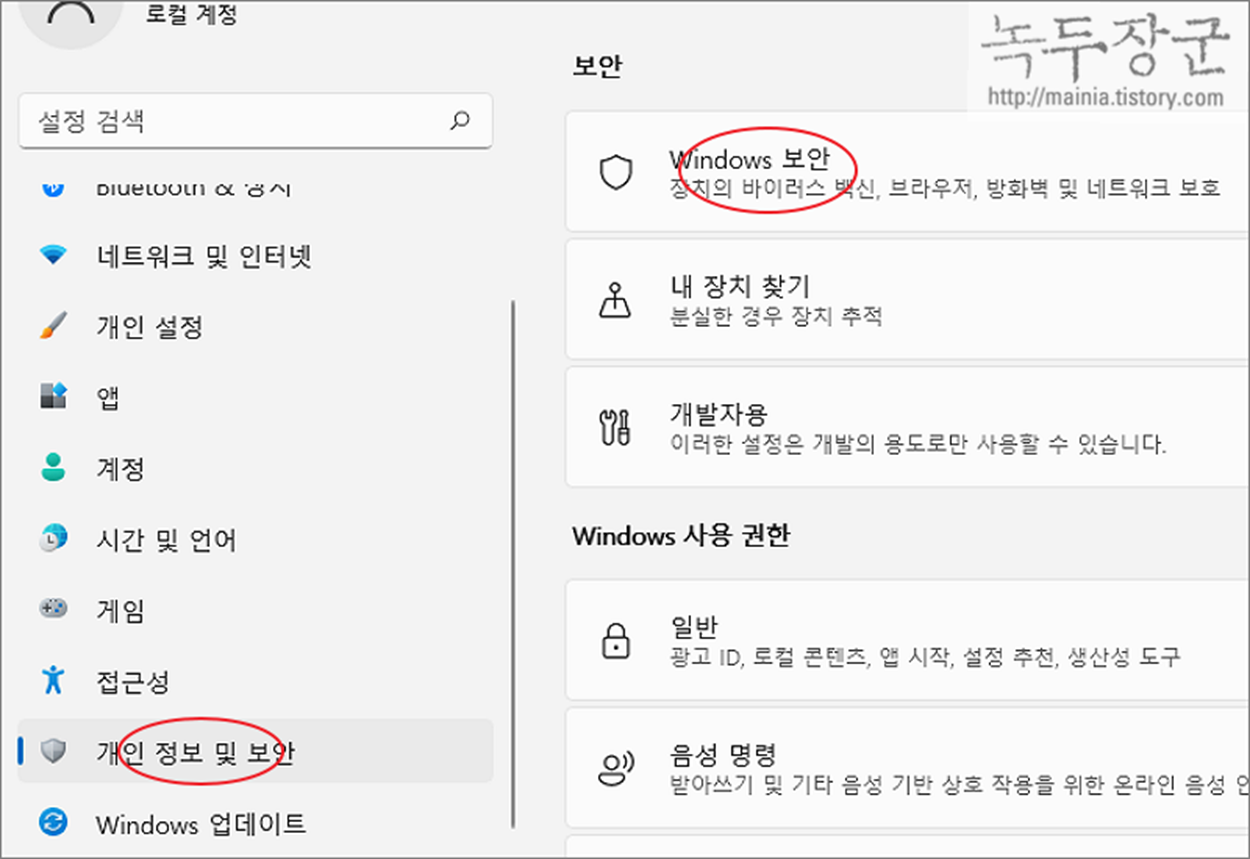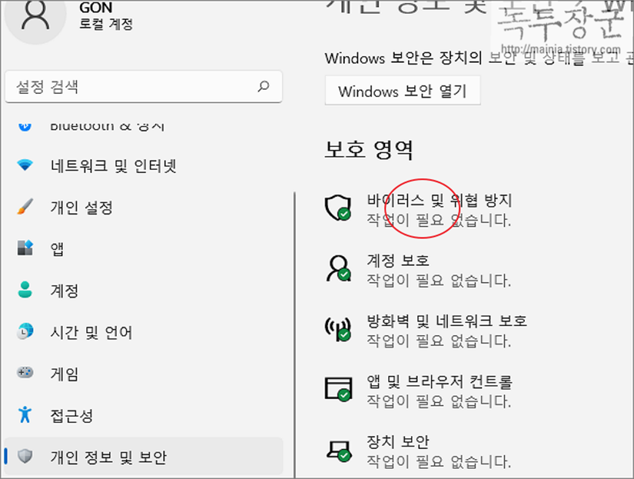 ▼ 설정 화면의 왼쪽 사이드에서 개인 정보 및 보안 > Windows 보안 메뉴를 선택합니다.