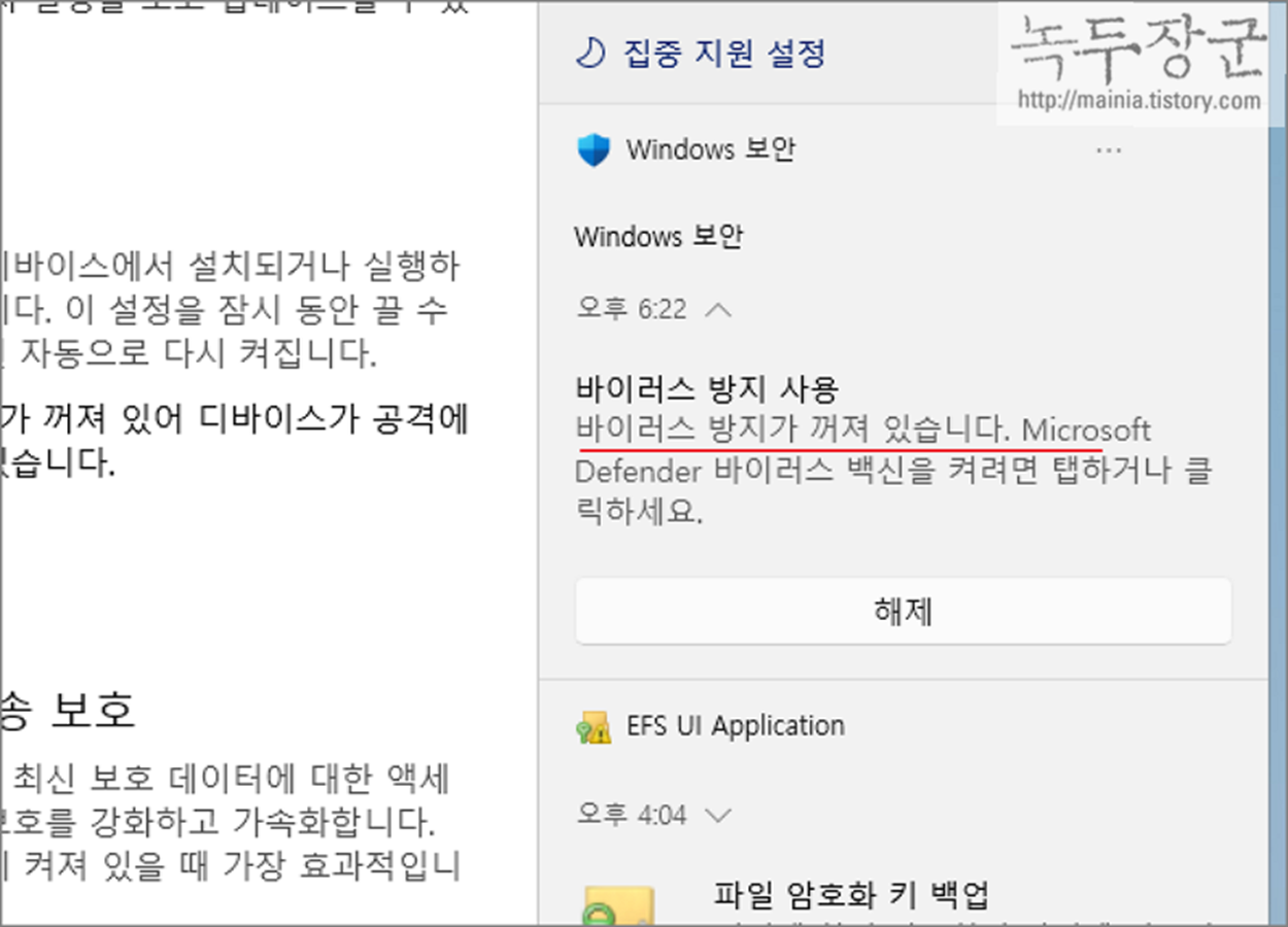 ▼ 윈도우 알람에도 실시간 보호가 꺼져 있다는 것을 확인할 수 있습니다. 다음에 실시간 보호 옵션의 활성화 여부를 이곳에서 확인합니다. 작업이 끝나고 난 이후에는 반드시 실시간 보호 옵션을 켜기 바랍니다.
