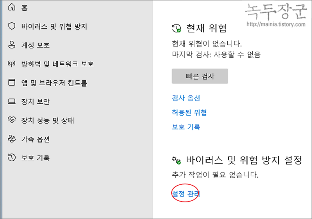 ▼ 한번 더 바이러스 및 위협 방지 화면에서 바이러스 및 위협 방지 설정 > 설정 관리 메뉴를 클릭합니다.
