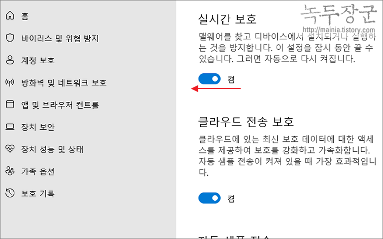 ▼ 실시간 보호 항목을 찾아 옵션을 켬 에서 끔으로 변경합니다. 이제 실시간 보호 기능을 끄는 것입니다.