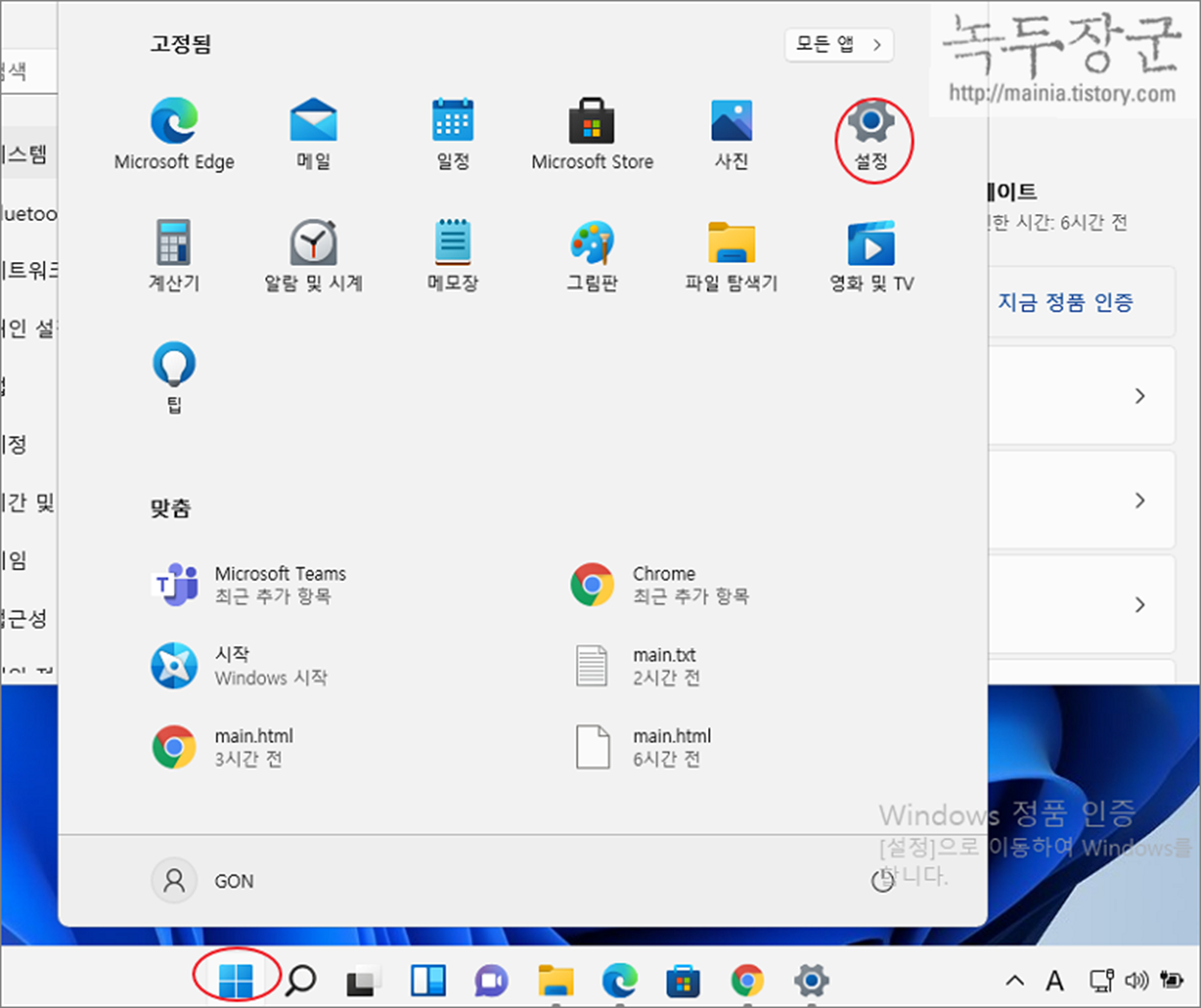 ▼ 디펜더 실시간 감시를 끄기 위해 설정 화면으로 이동합니다. 작업 표시줄 중앙에 윈도우 > 설정 메뉴를 클릭합니다.