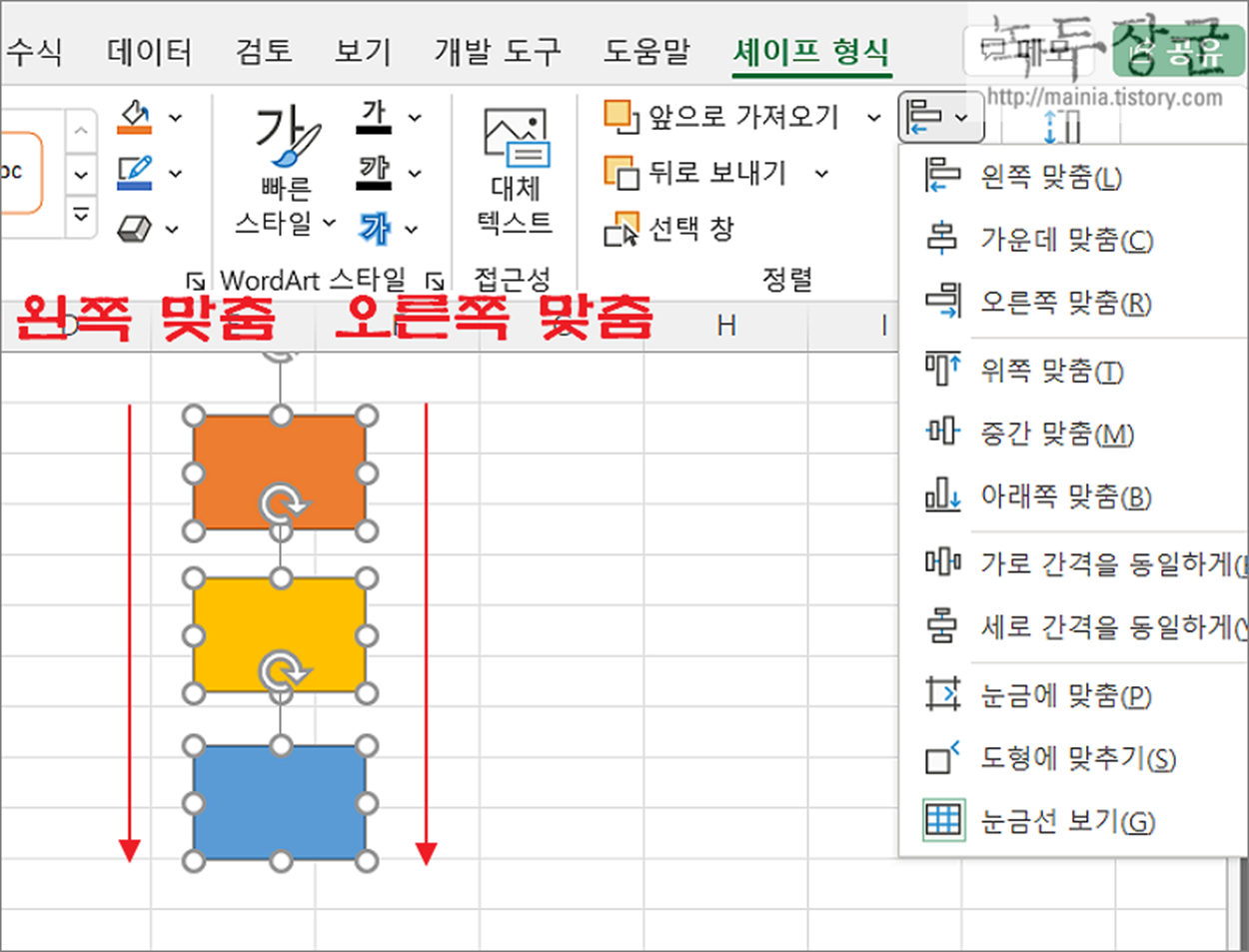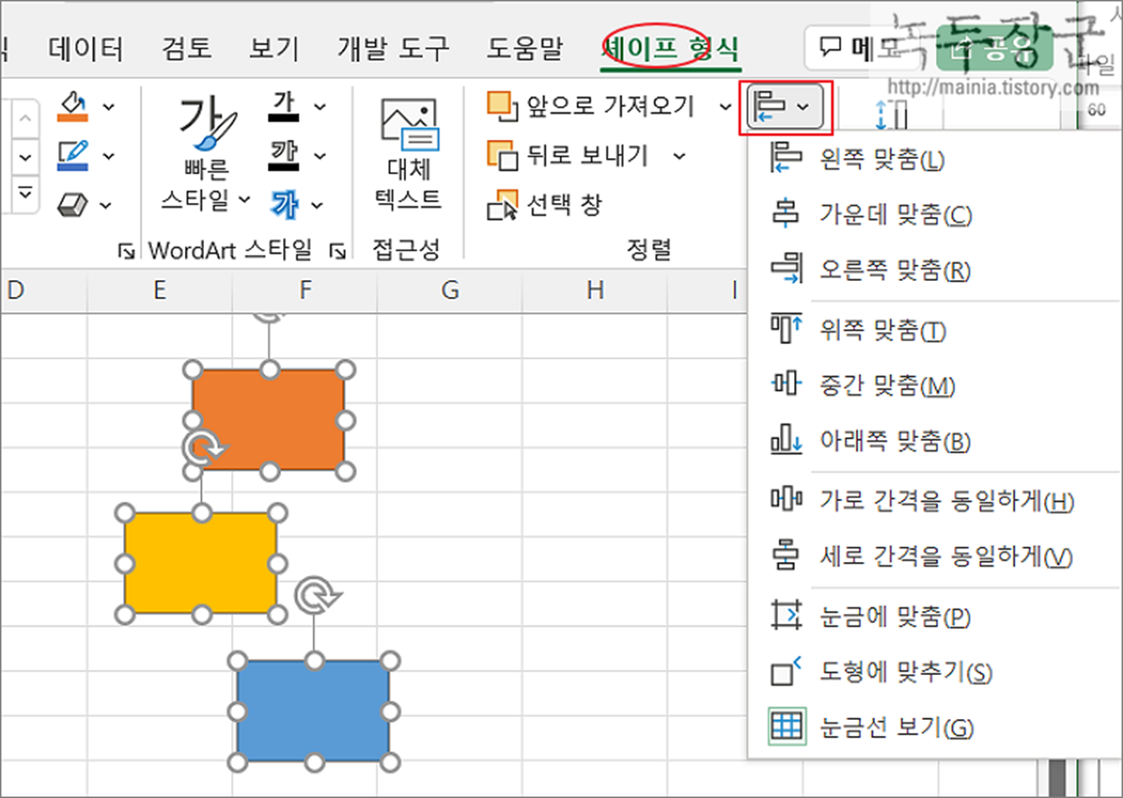 ▼ 도형을 선택하면 이전에 없던 리본 메뉴 그룹 탭인 "셰이프 형식" 이 나타납니다. 이곳 정렬 항목으로 가면 맞춤 리본 메뉴가 있습니다. 맞춤은 크게 3가지 종류로 나눌 수 있습니다. 왼쪽/오른쪽, 위쪽/아래쪽, 간격 정렬 입니다. 나머지 하나는 마우스를 사용해서 정렬할 때 유용한 옵션입니다.