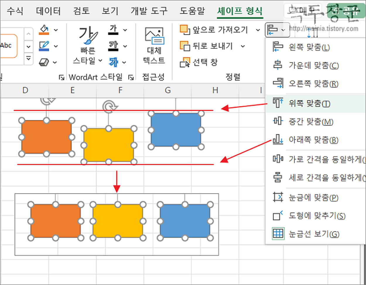 ▼ 위쪽/아래쪽 맞춤 도 마찬가지입니다. 제일 위/아래 도형 라인을 기준으로 정렬합니다.