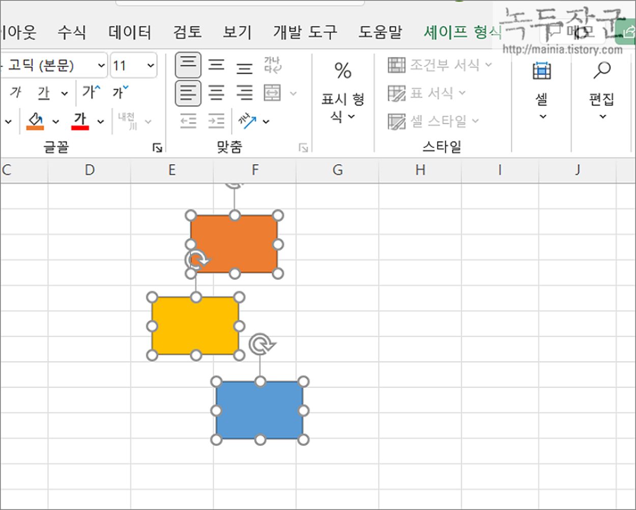 | ※ 아래는 참고하면 좋을 만한 글들의 링크를 모아둔 것입니다. ※ ▶ 엑셀(Excel) 도형 안에 셀 참조해서 데이터 넣기 ▶ 엑셀 Excel 도형 연결선 기울어짐 없이 일직선으로 연결하기 ▶ 엑셀 Excel 메모 모양 원하는 대로 변경하기 ▶ 엑셀 셀 크기 변경될 때 포함된 도형의 크기 변경을 막고 싶을 때 ▶ 엑셀 Excel 이미지 원하는 모양으로 쉽게 자르기 |