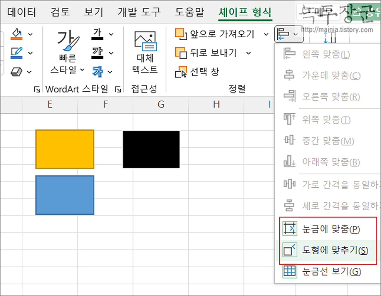 ▼ “눈금에 맞춤” 과 “도형에 맞춤” 은 마우스로 드래그해서 도형을 맞출 때 유용한 옵션입니다. 메뉴를 클릭해서 옵션을 활성화/비활성화 할 수 있습니다. 옵션을 체크하지 않고 도형을 움직이면 부드럽게 이동은 가능하지만 정확하게 도형을 정렬하는 것이 쉽지 않습니다. 만약 옵션을 켜고 도형을 움직여 보세요. 바로 옆에 도형과 위치가 일치하는 순간 잠시 멈췄다가 움직입니다. 사용자는 그 순간 도형이 정렬되었다는 것을 알고 마우스를 멈추면 됩니다.