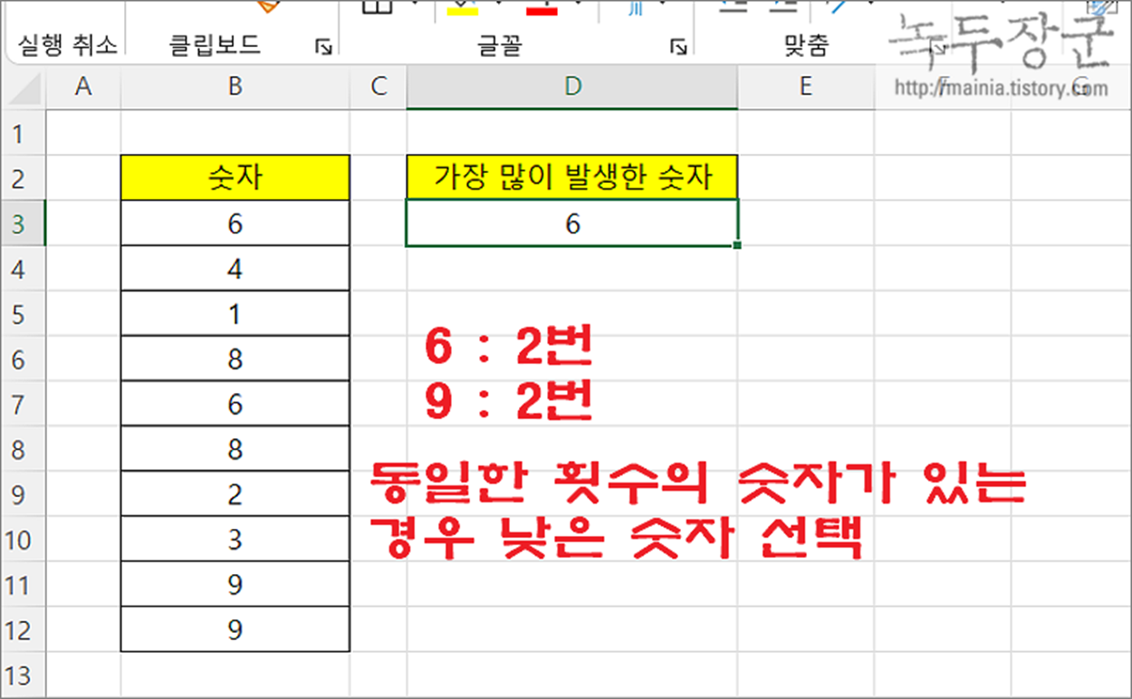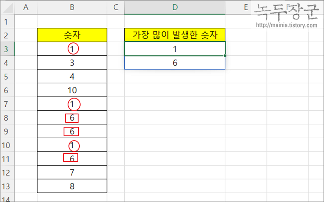 ▼ 아래 샘플에서는 동일하게 3번 발생한 숫자가 1, 6 입니다. MODE.SNGL 함수라면 1 만 나타날 겁니다. 이렇게 중복 추출까지 생각하고 있다면 MODE.MULT 함수를 사용하는 것이 좋습니다.