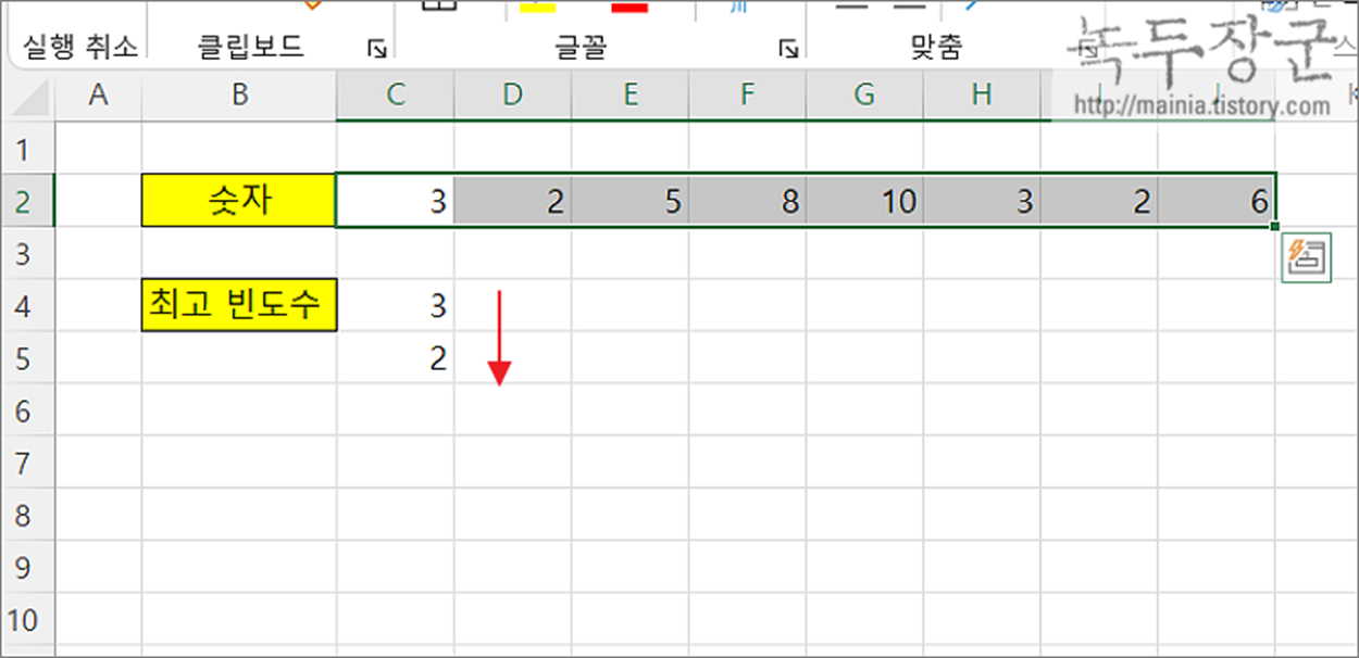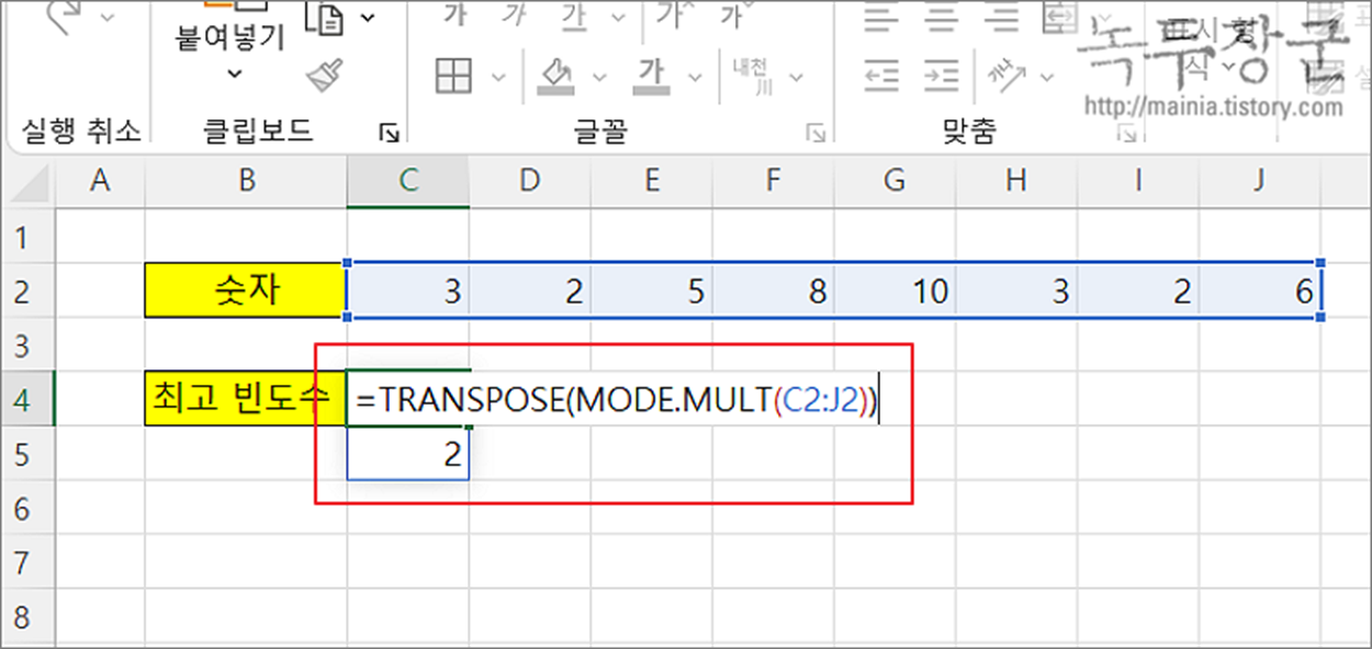 ▼ 다음은 세로가 아닌 가로 방향으로 숫자가 나열되어 있는 경우입니다. 가장 빈도수가 많은 숫자를 가로로 보고 싶을 때 사용할 수 있는 방법입니다. 그림처럼 MODE.MULT 인 경우 빈도수가 같은 숫자 여러 개를 배열로 반환하기 때문에 아래로 나열합니다. 이것을 가로로 배치하기 위해서는 함수를 한 번 더 사용해야 합니다.
