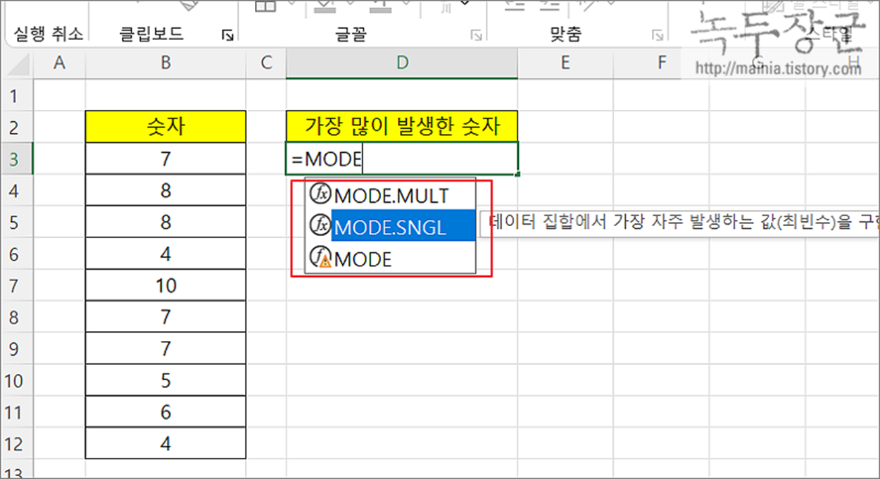 ▼ 랜덤으로 뽑은 숫자 범위에서 가장 많은 발생한 수를 판별하는 함수로 3가지를 사용할 수 있습니다. 제일 마지막에 MODE 는 주로 예전 엑셀 버전의 호환용으로 사용합니다. 느낌표 표시가 있듯이 사용을 자제하는 것이 좋기 때문에 설명에서 제외하겠습니다. 우선 MODE.SNGL 함수를 사용해 보겠습니다.