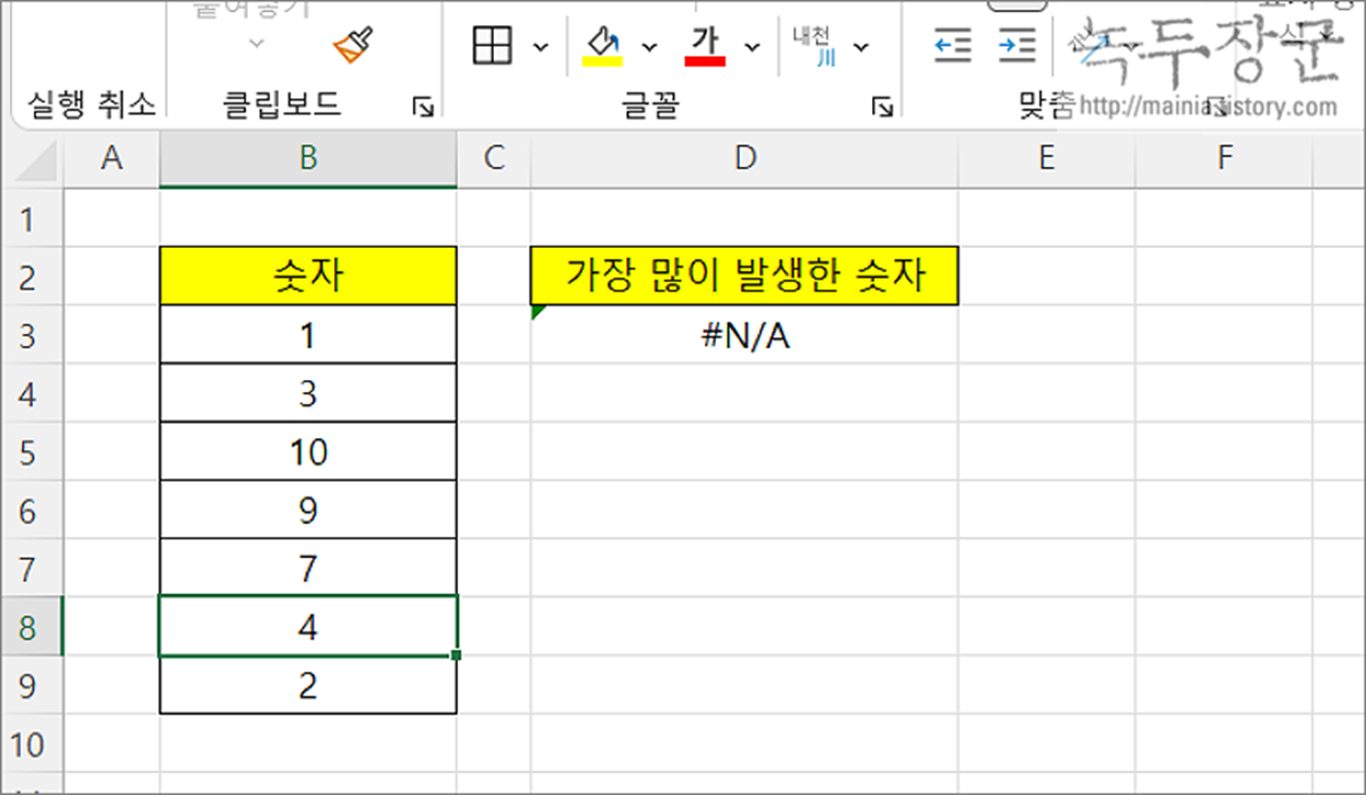 ▼ MODE 함수에서 값을 반환하기 위한 조건은 2개 이상의 중복되는 숫자가 있어야 합니다. 하나라도 없다면 #N/A 오류가 발생합니다.