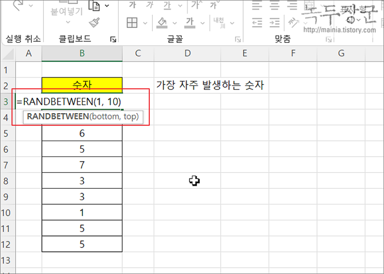 ▼ 우선 테스트에 사용할 숫자를 랜덤으로 뽑아보겠습니다. 함수는 RANDBETWEEN 입니다. 매개변수로 입력한 1 ~ 10 사이의 숫자를 랜덤으로 반환합니다.