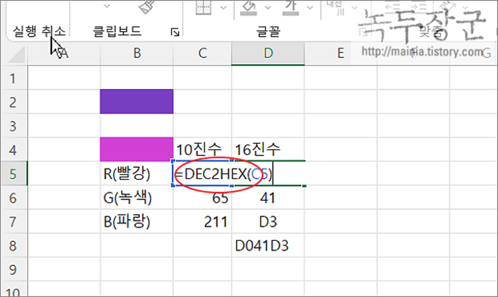 ▼ 실제 10 진수 RGB 값이 대화상자에서 보여준 헥사값과 동일한지 알아보겠습니다. 먼저 색의 10진수 값만 안다고 전제하겠습니다. 208, 65, 211 값을 DEX2HEX 함수로 변환합니다.