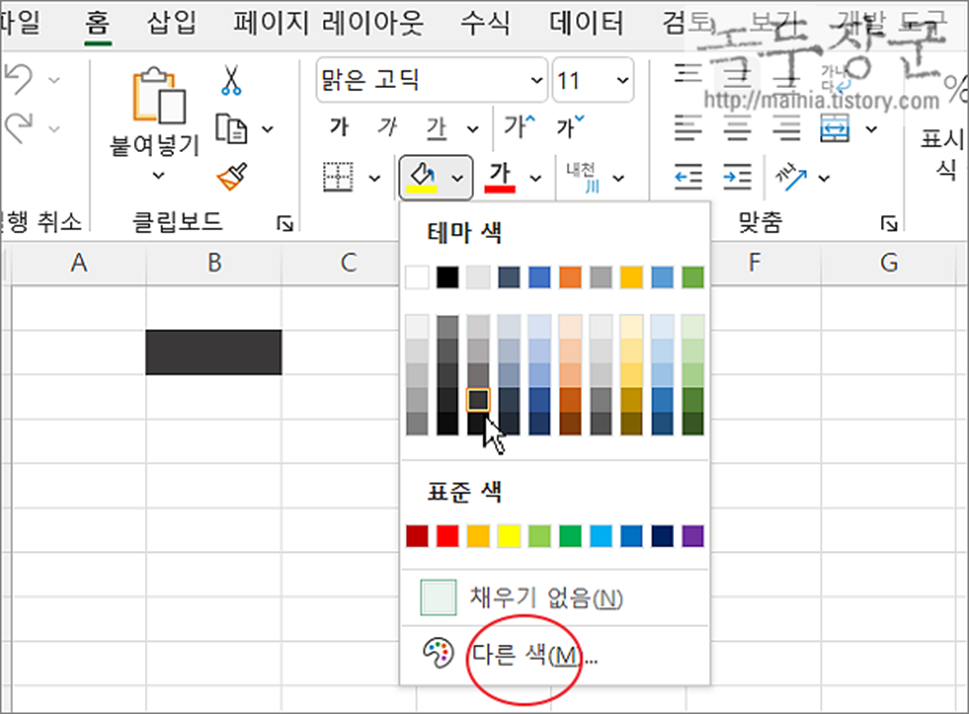 ▼ 색상에 대한 10진수와 16진수를 알기 위해 홈 탭 > 테마 색 리본 메뉴를 클릭합니다. 색 선택 화면에서 아래로 내려가 "다른 색" 메뉴를 클릭합니다.