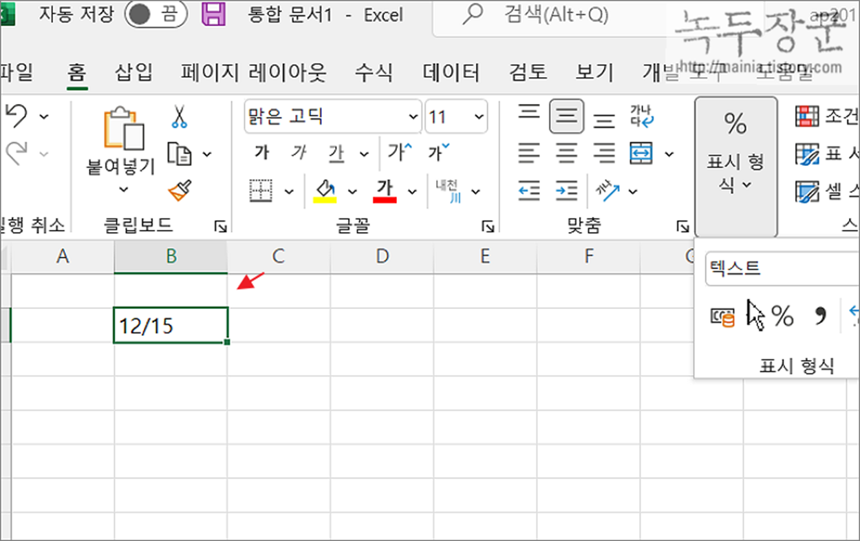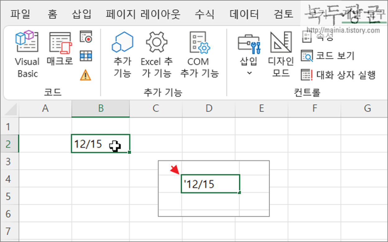 ▼ 그림처럼 셀에 12/15 라고 입력하면 날짜로 인식해서 자동으로 변환합니다. 이런 자동 변환을 막기 위한 여러가지 방법이 있습니다.