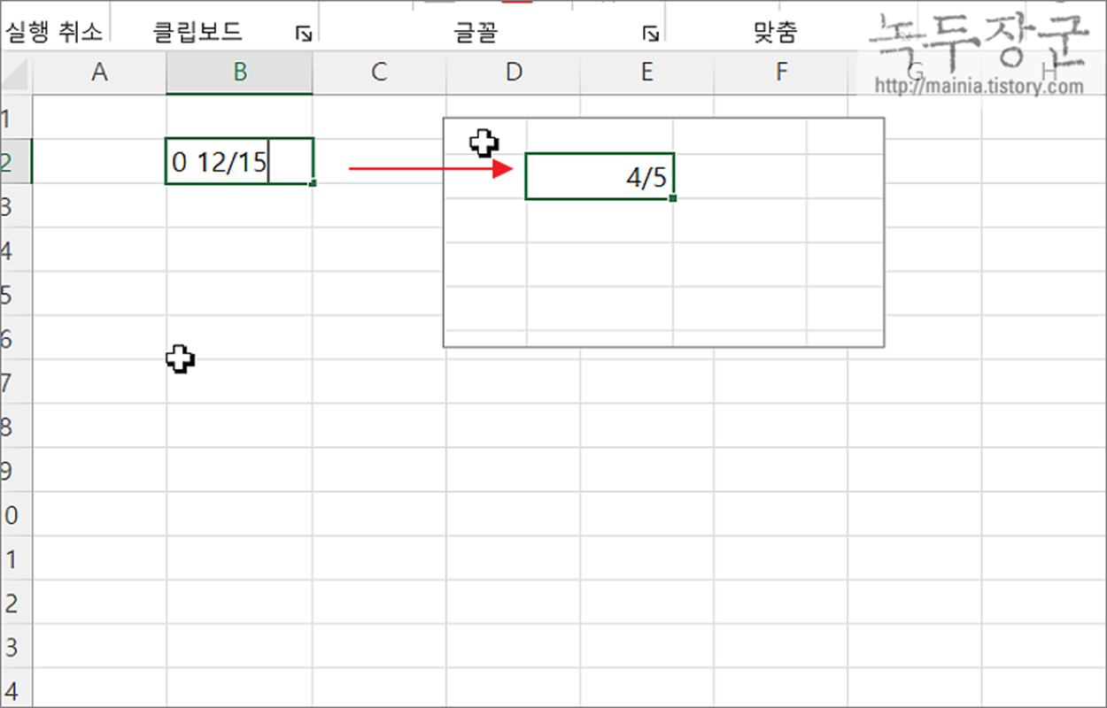 ▼ 하지만 입력한 분수에서 나눠지는 수가 있으면 안 됩니다. 그림처럼 12/15 가 3으로 나눌 수 있기 때문에 4/5 로 변환이 됩니다. 해당 방식은 날짜를 입력하기에는 적당하지 않습니다.