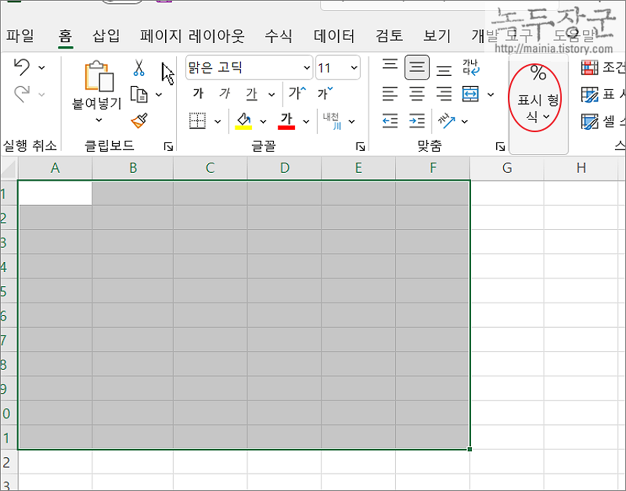 ▼ 첫 번째는 셀 표시 형식을 텍스트로 변경하는 것입니다. 값을 입력할 셀 영역을 선택하고 홈 탭 > 표시 형식 리본 메뉴를 클릭합니다.