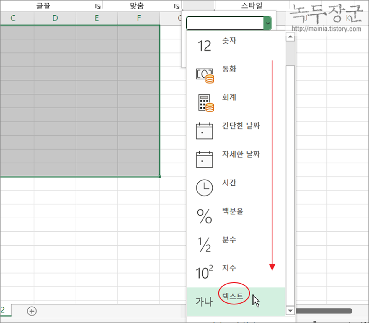 ▼ 다음은 표시 형식 목록에서 텍스트를 찾아 선택합니다. 선택한 셀의 표시 형식은 일반에서 텍스트로 변경됩니다.
