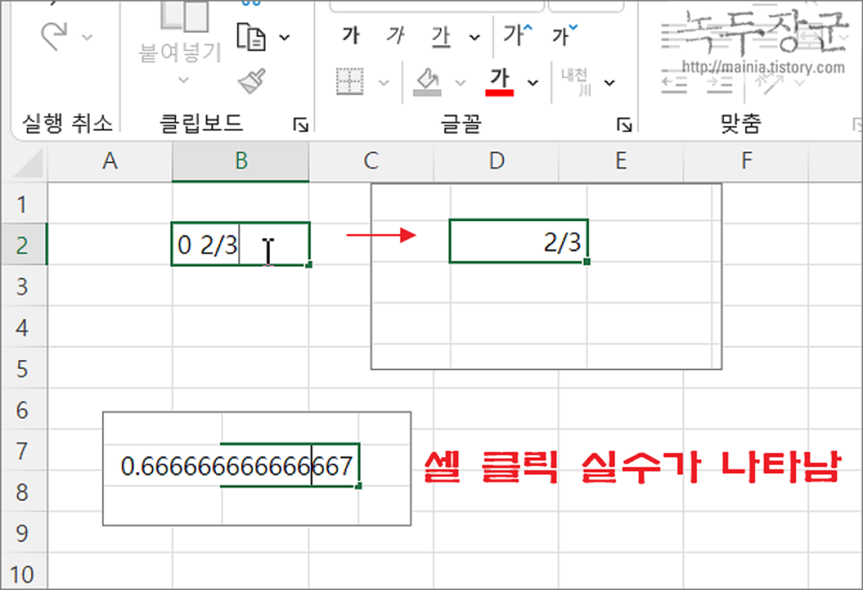 ▼ 세 번째는 0 을 앞에 넣고 분수를 입력합니다. 결과는 날짜로 인식되지 않고 분수 그대로 표현합니다. 이 방법은 분수 형태의 데이터에만 해당합니다. 그리고 데이터가 분수이기 때문에 실제 값은 소수점인 실수 입니다.