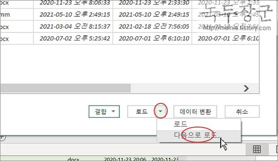 ▼ 창 하단에 콤보 박스의 화살표를 클릭해서 다음으로 로드 메뉴를 선택합니다.