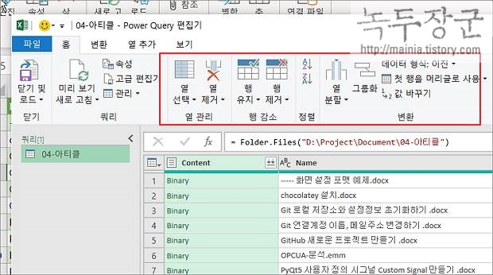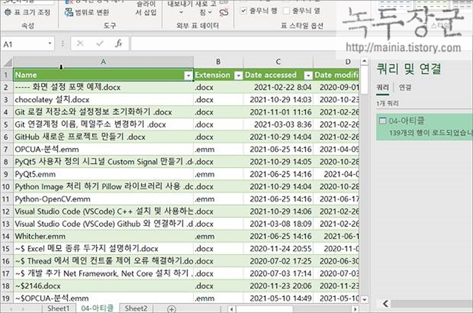 ▼ 시트에는 폴더에 있던 파일들을 불러와서 보여줍니다. 해당 화면은 외부 데이터를 불러올 때 사용하는 쿼리 및 연결 화면입니다.