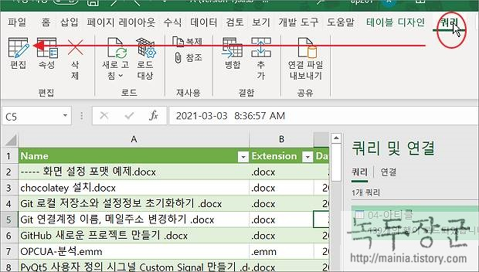 ▼ 쿼리로 불러온 데이터는 쿼리 편집 기능을 이용해야 합니다. 물론 엑셀 “표” 처럼 셀을 추가하거나 삭제하는 등의 수정도 가능합니다. 하지만 연결한 쿼리를 재사용하기 위해서는 쿼리 편집기로 수정을 해야 합니다. 상단 쿼리 탭 > 편집 리본 메뉴를 클릭합니다.