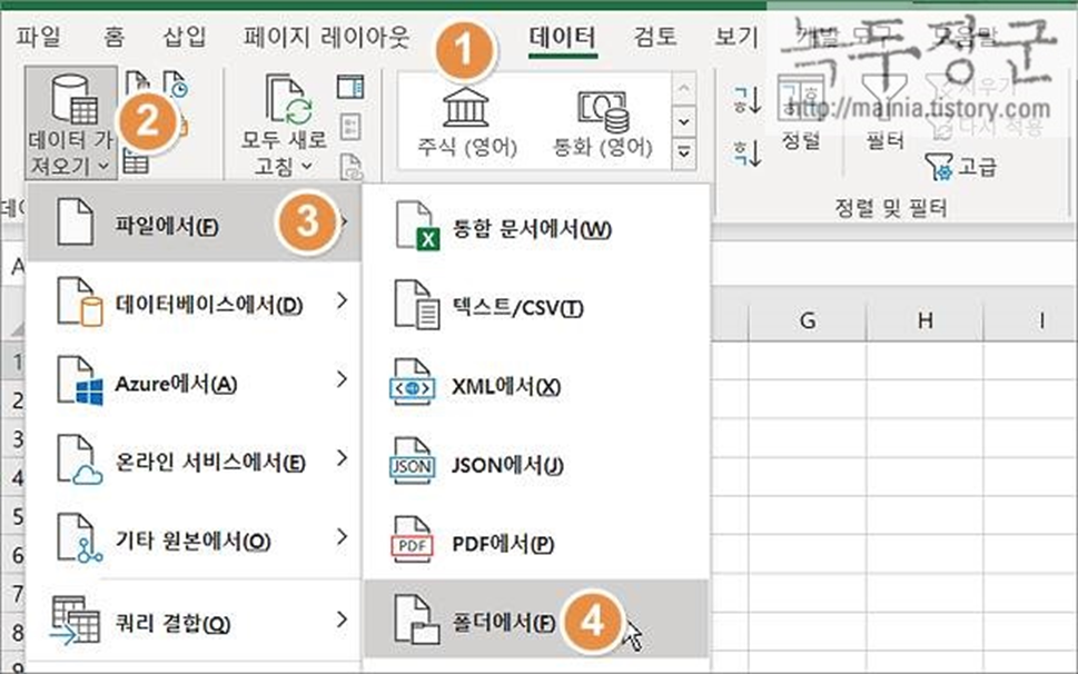▼ 탐색기에서 파일을 가져오기 위해 데이터 가져오기 기능을 사용해 보겠습니다. 데이터 탭 > 데이터 가져오기 > 파일에서 > 폴더에서 메뉴를 차례대로 선택합니다.