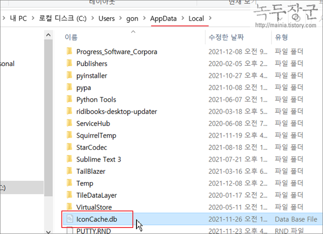 ▼ AppData > Local 폴더로 들어가서 IconCache.db 파일을 찾아 삭제합니다.