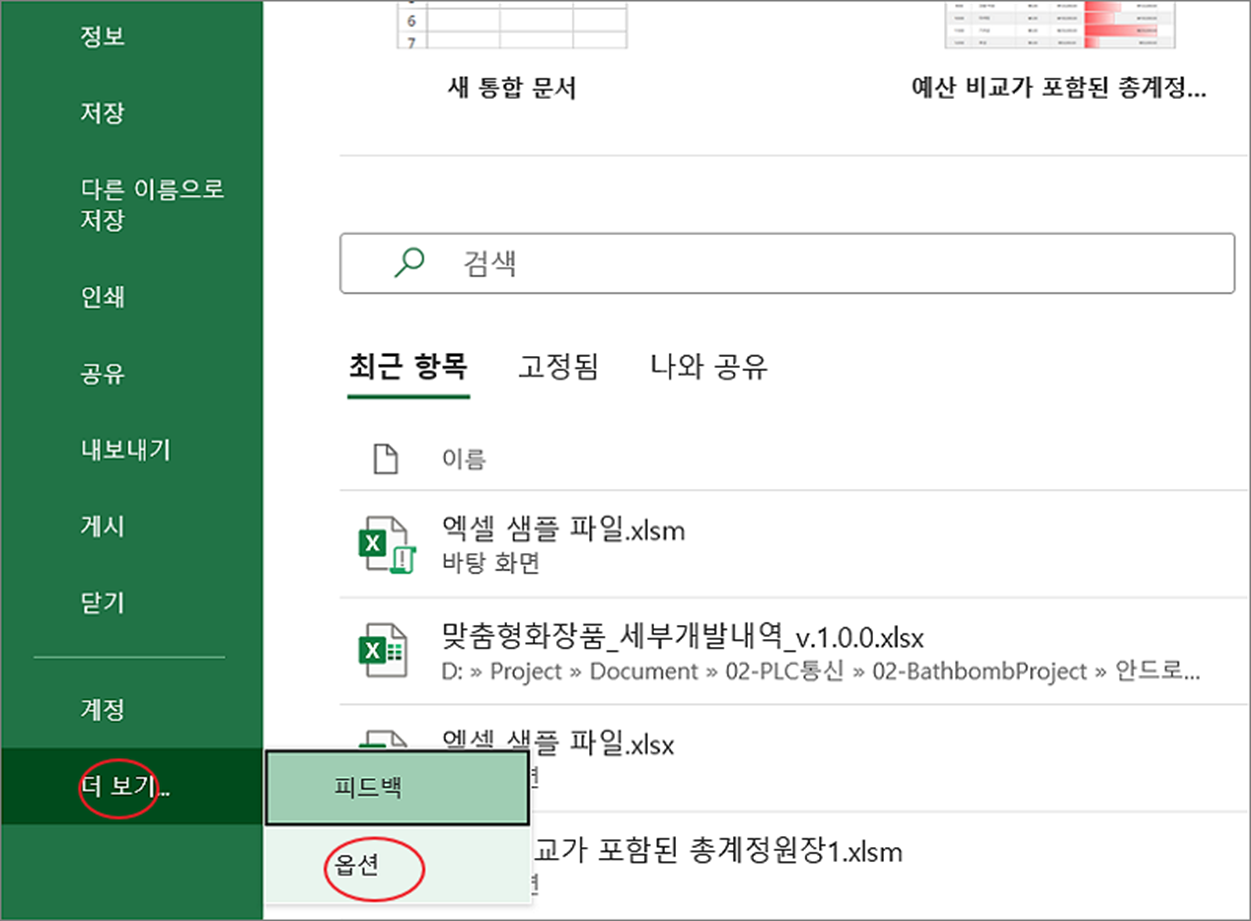 ▼ 두 번째 방법은 엑셀 옵션 화면에서 조절하는 방법입니다. 파일 > 더 보기 > 옵션 메뉴를 클릭합니다.
