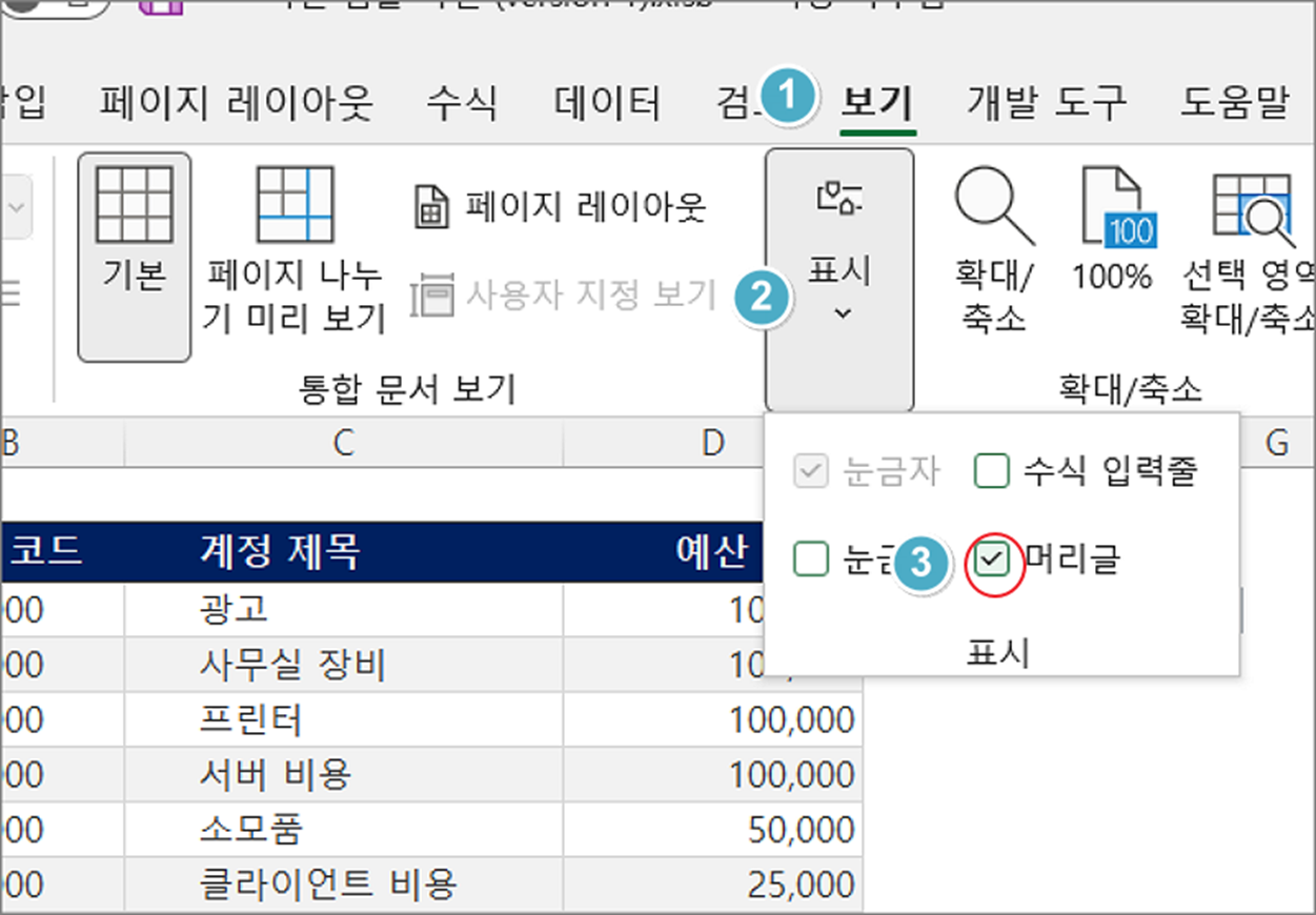 ▼ 리본 메뉴의 옵션을 통해서 간단하게 조절이 가능합니다. 보기 탭 > 표시 하위 옵션에서 머리글을 체크하거나 해제해 보세요.