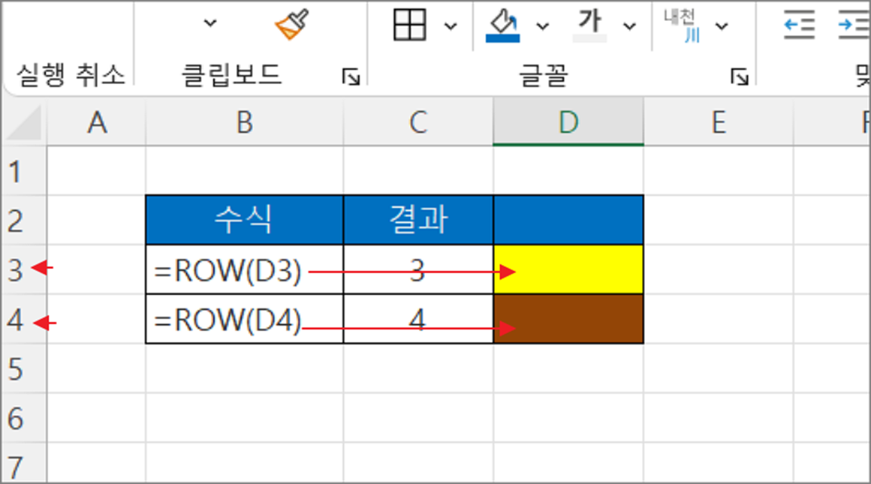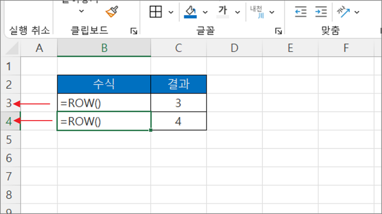 - ROW(셀) : 매개변수로 넘긴 셀의 행 번호를 구합니다.