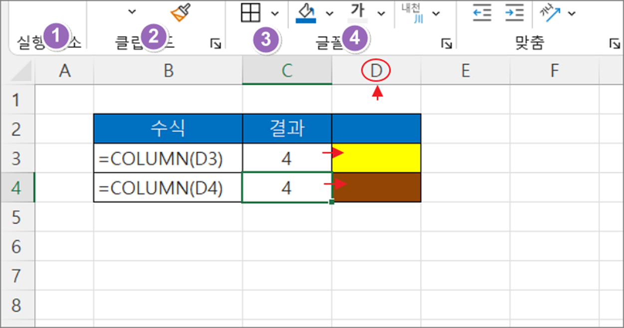 ▼ COLUMN 함수로는 열 번호를 알 수 있습니다. 단, “열” 을 지칭하는 알파벳이 아닌 번호를 반환합니다. 그림처럼 결과값은 D 에 해당하는 4 입니다.