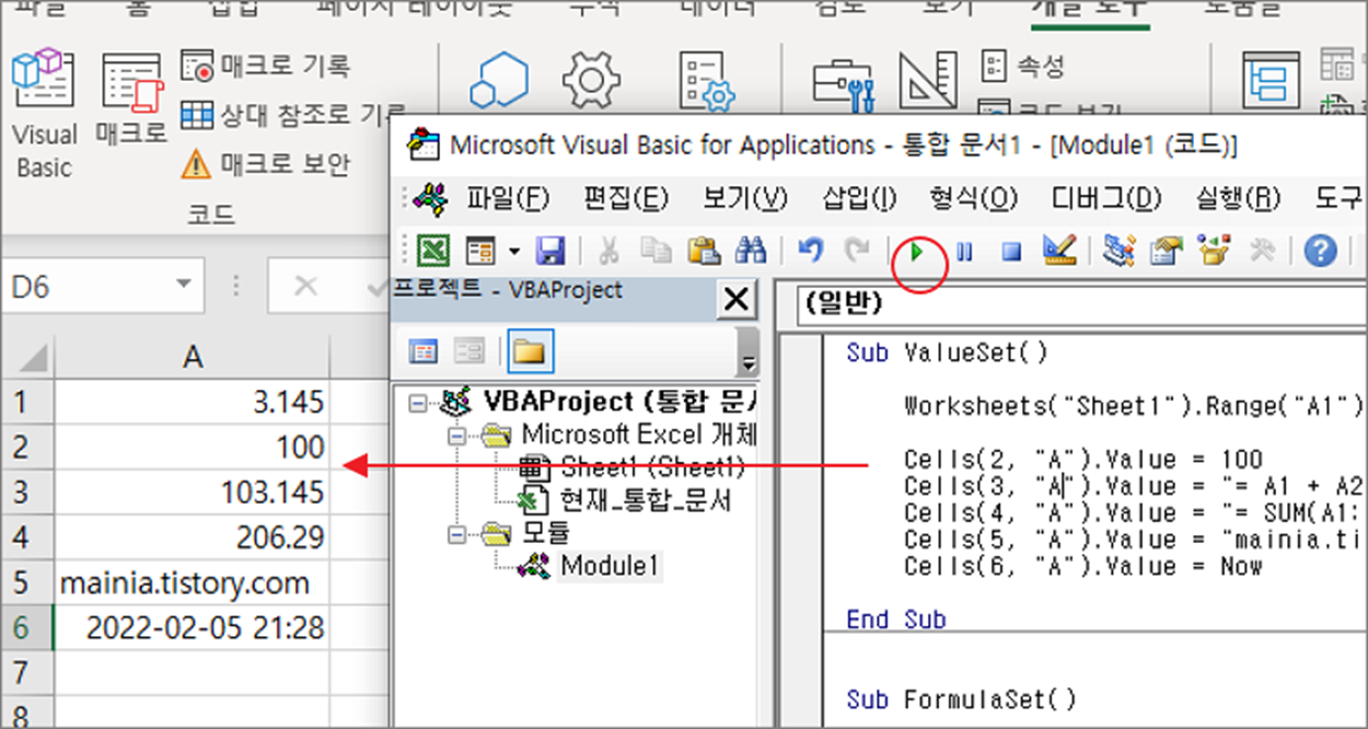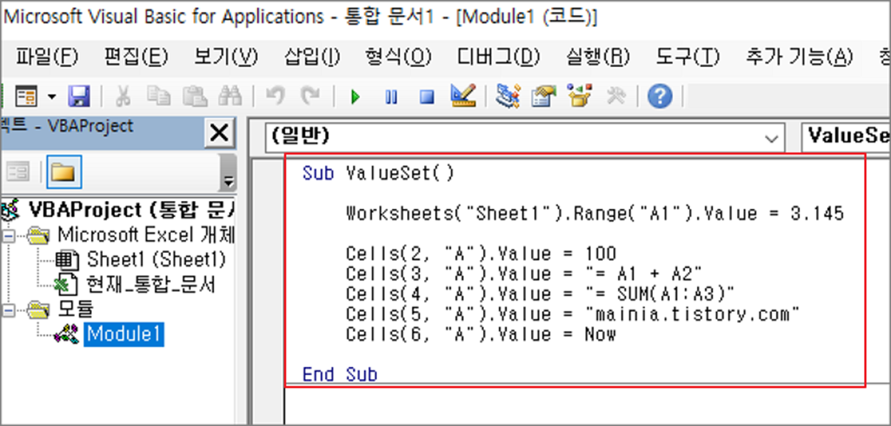 Cells(5, "A").Value = "mainia.tistory.com"