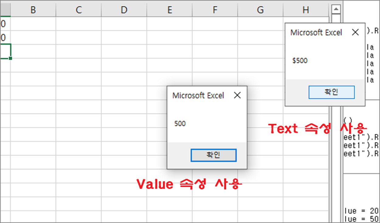 ▼ Text 속성은 값을 출력할 때 사용합니다. Value 와 달리 출력 포맷을 사용자가 지정하고 싶을 때 사용하는 속성입니다. 엑셀의 사용자지정 포맷과 같습니다. 아래 소스는 A1,A2 에 입력한 값이 어떻게 다르게 출력되는지 보여줍니다. Text 에 출력하는 값의 포맷은 NumberFormatLocal 속성으로 변경합니다. Value 와 어떻게 다른지 비교해 보세요.