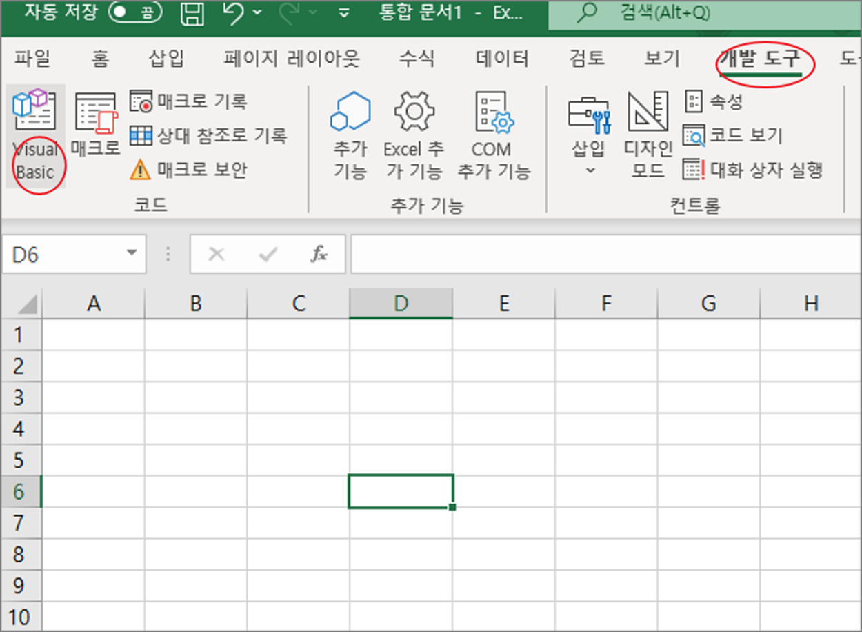▼ 먼저 코드 작성을 위해 Visual Basic 코드 입력창을 띄웁니다. 개발 도구 > Visual Basic 리본 메뉴를 클릭합니다.