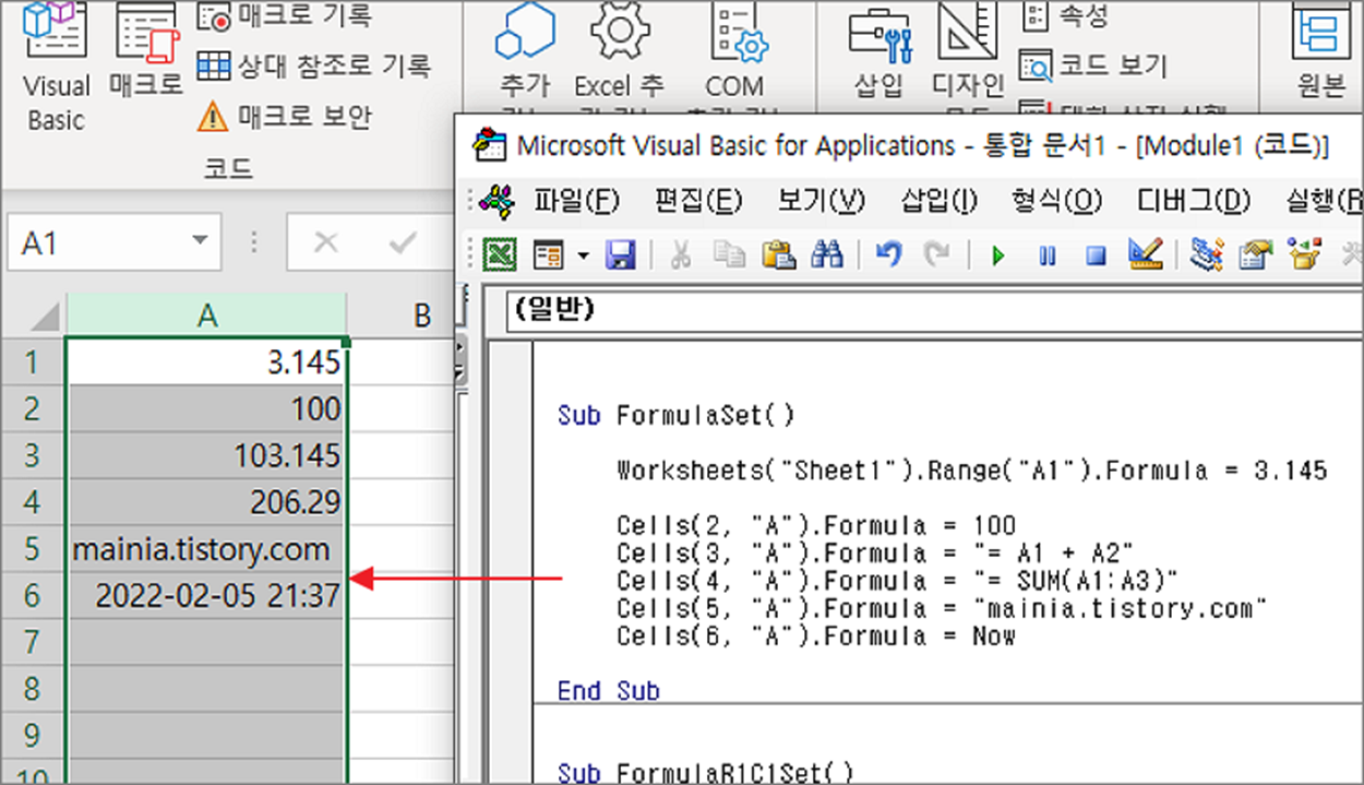 Cells(5, "A").Formula = "mainia.tistory.com"