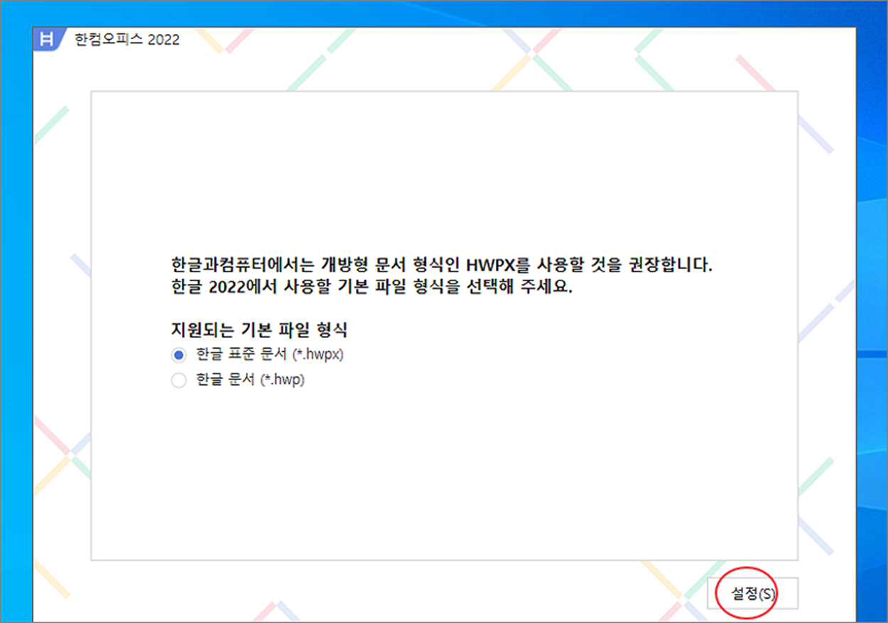 ▼ 다음에 한글에서의 최신 문서 포맷인 HWPX 를 기본 형식으로 사용할 것인지 묻는 화면이 나타납니다. 만약 오래된 한글 문서들을 열어야 되는 경우 HWPX 가 아닌 HWP 를 기본 파일 형식으로 선택하세요.