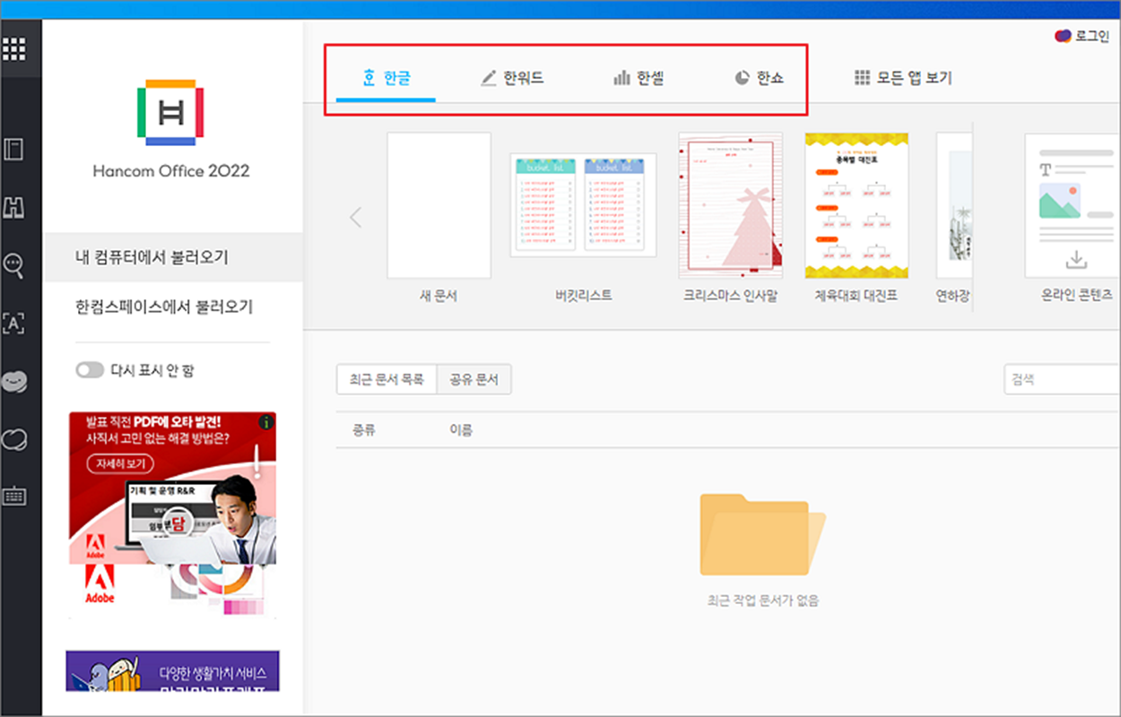 ▼ 한컴오피스 관리화면이 뜨면 오른쪽 상단에 원하는 프로그램을 찾아 실행합니다.