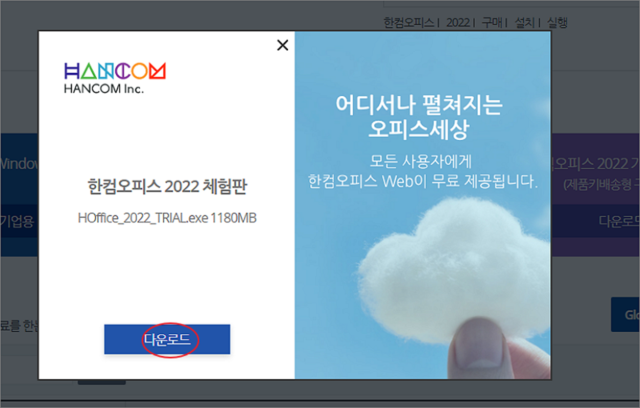 ▼ 제품 다운로드 페이지에는 올해 최신 버전인 2022 를 선보이고 있습니다. 다운로드 종류는 2가지입니다. 통합뷰어가 아닌 한컴오피스 2022 체험판을 다운받습니다.