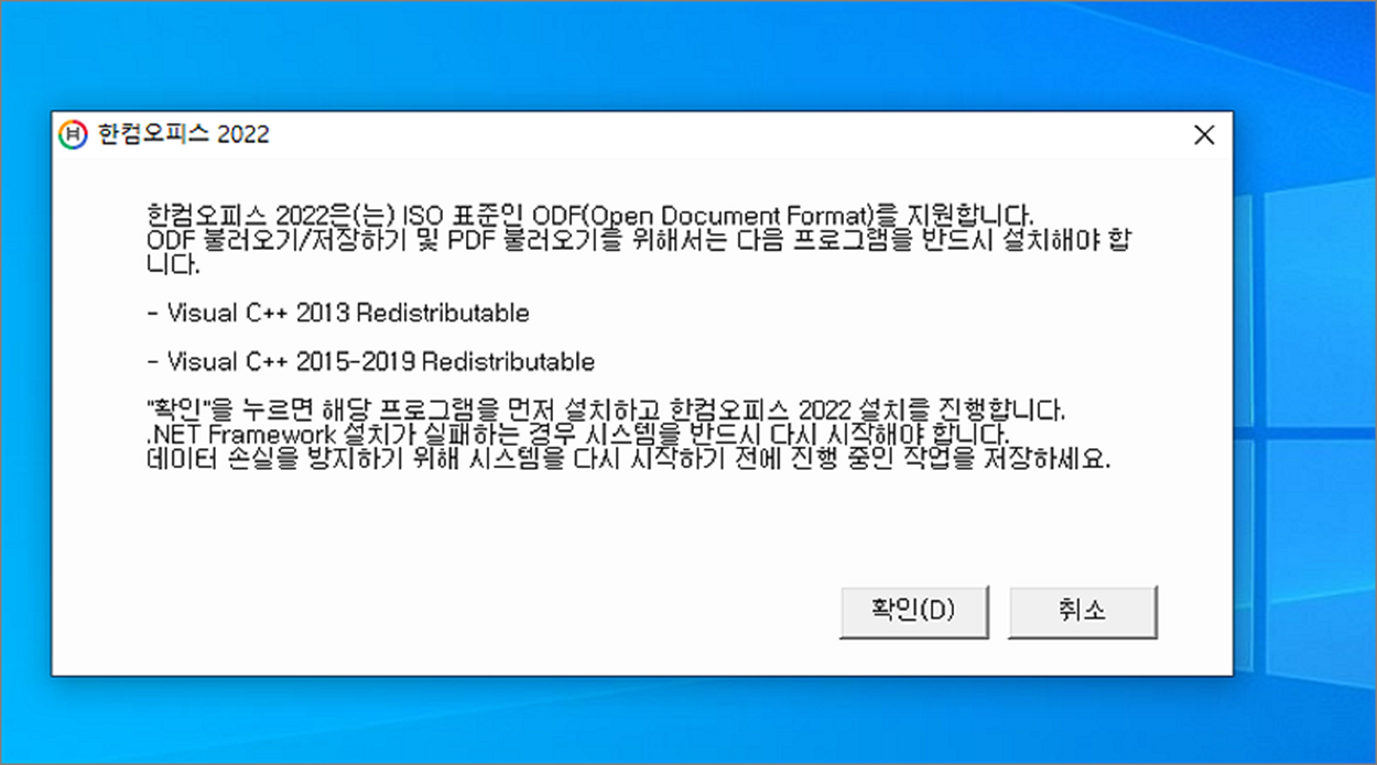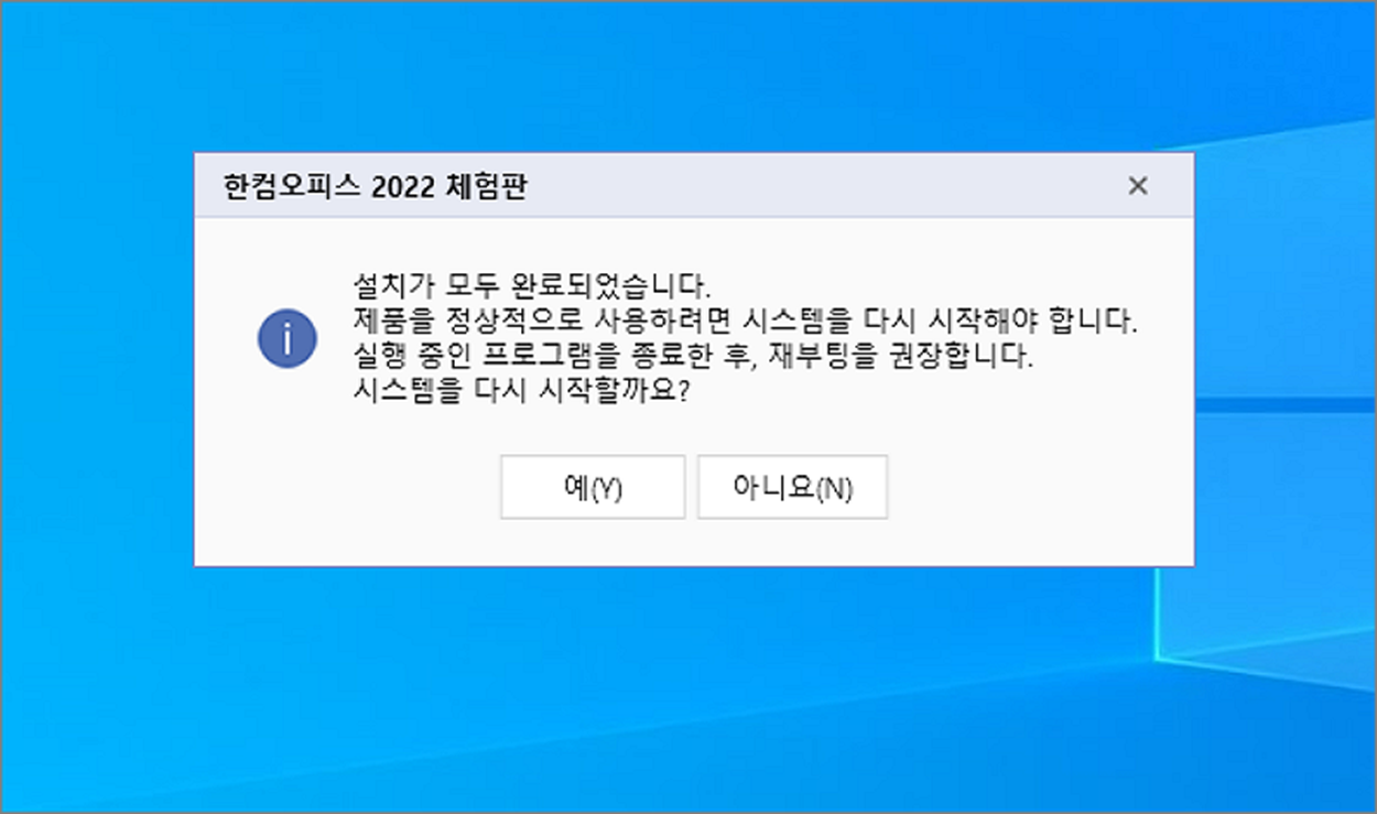 ▼ 설치가 끝나면 재부팅 여부를 묻습니다. 저장이 필요한 다른 작업들을 진행 중이라면 굳이 시스템을 다시 시작하지 않아도 됩니다. 재부팅을 하지 않아도 거의 대부분의 한컴오피스 기능은 동작하기 때문입니다.